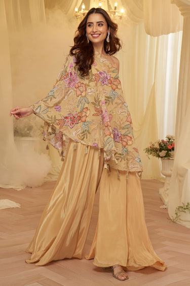 Cream Fancy Embroidery Work Indo Western Palazzo With One Shoulder Top