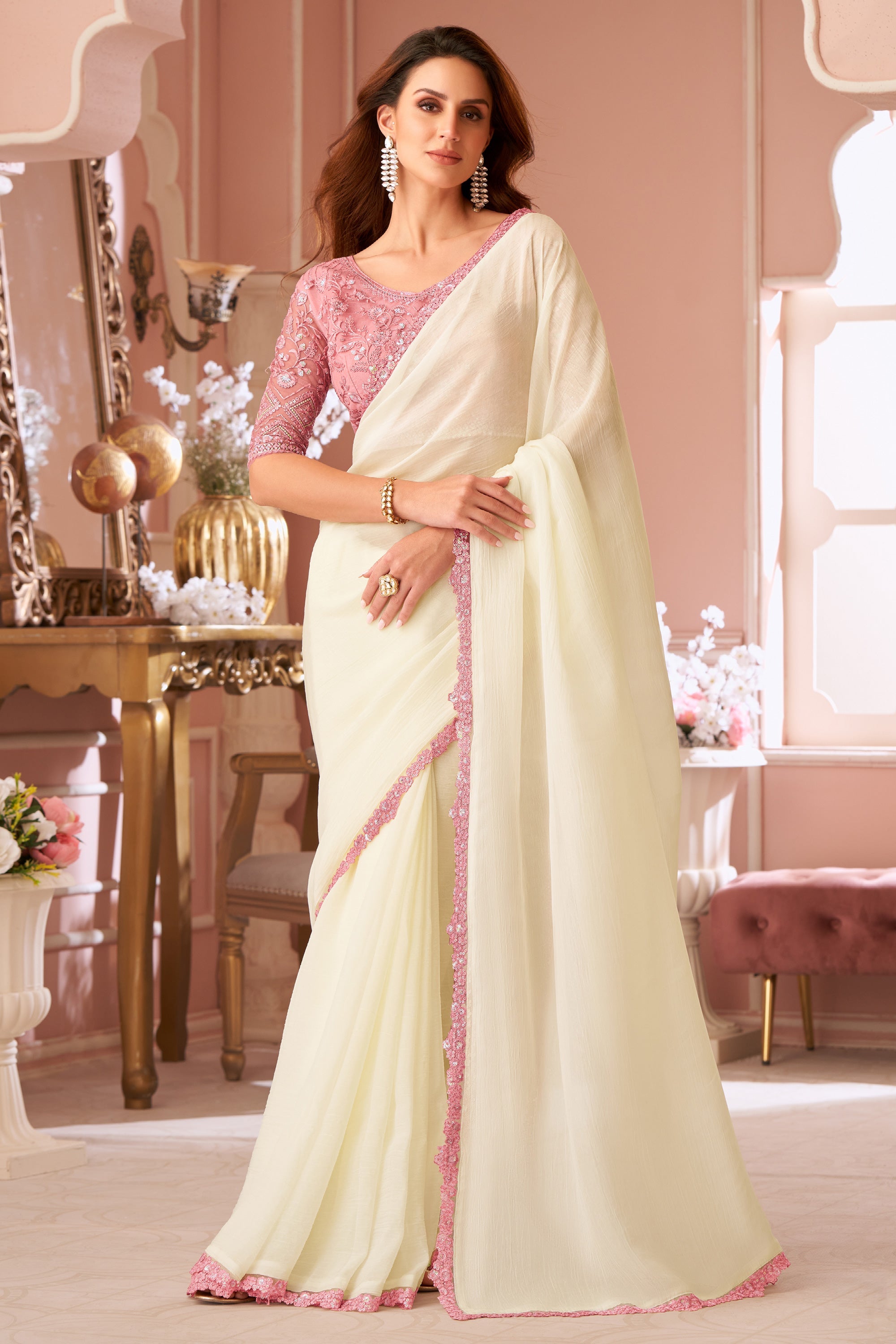 Cream Georgette Party Style Adroit Lace Work Saree With Designer Blouse