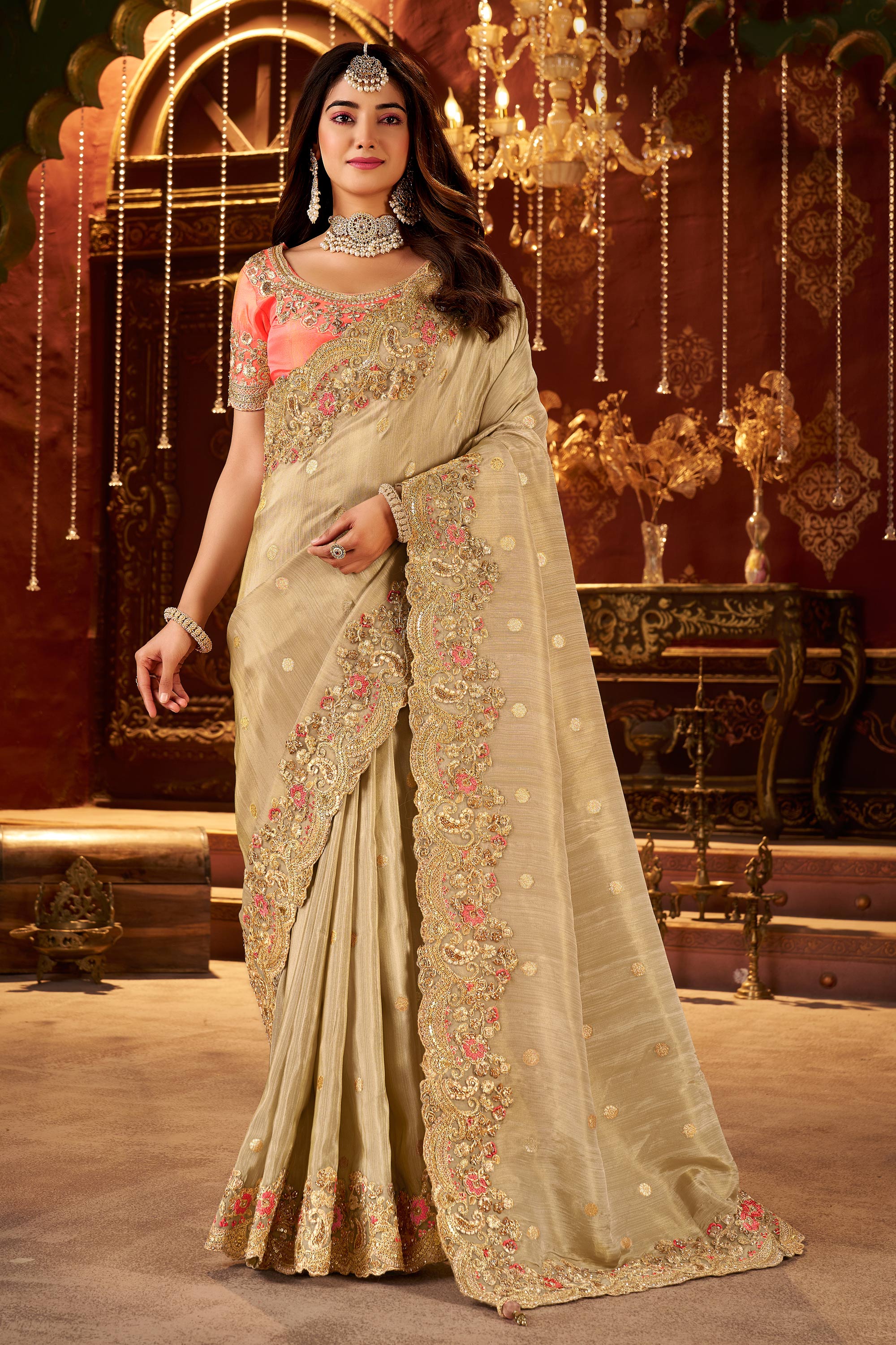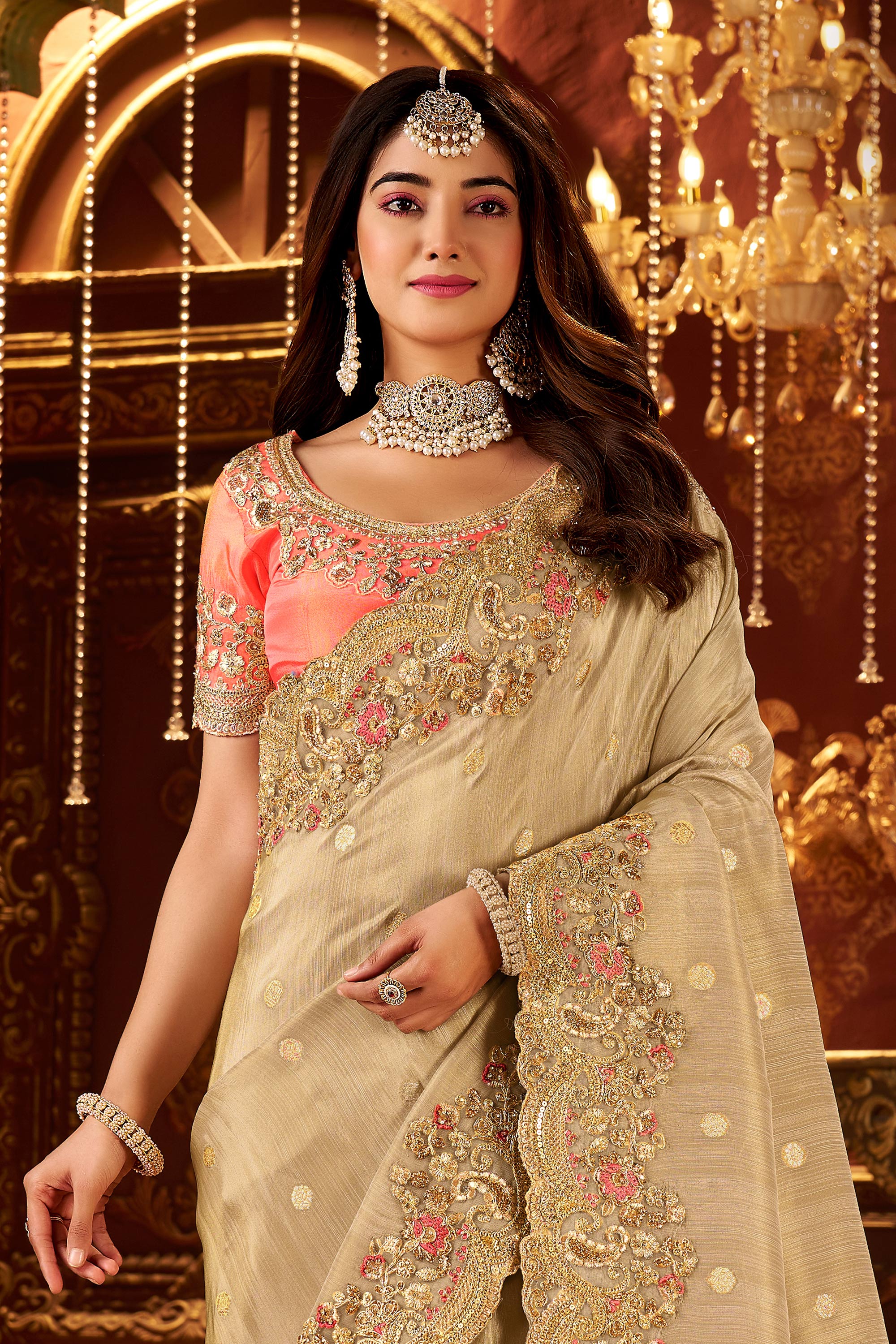 Cream Wedding Wear Art Silk Embroidered Border Work Saree