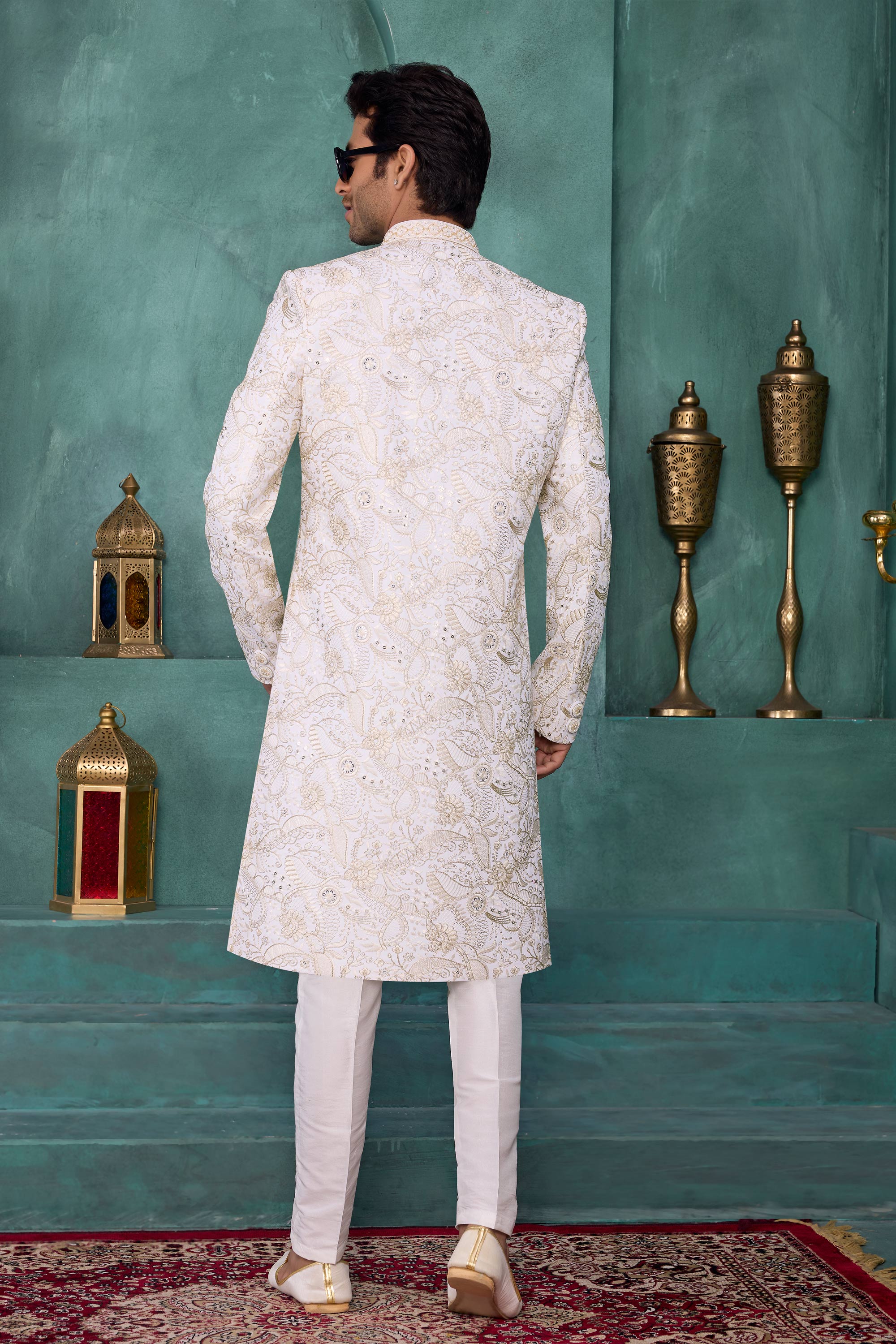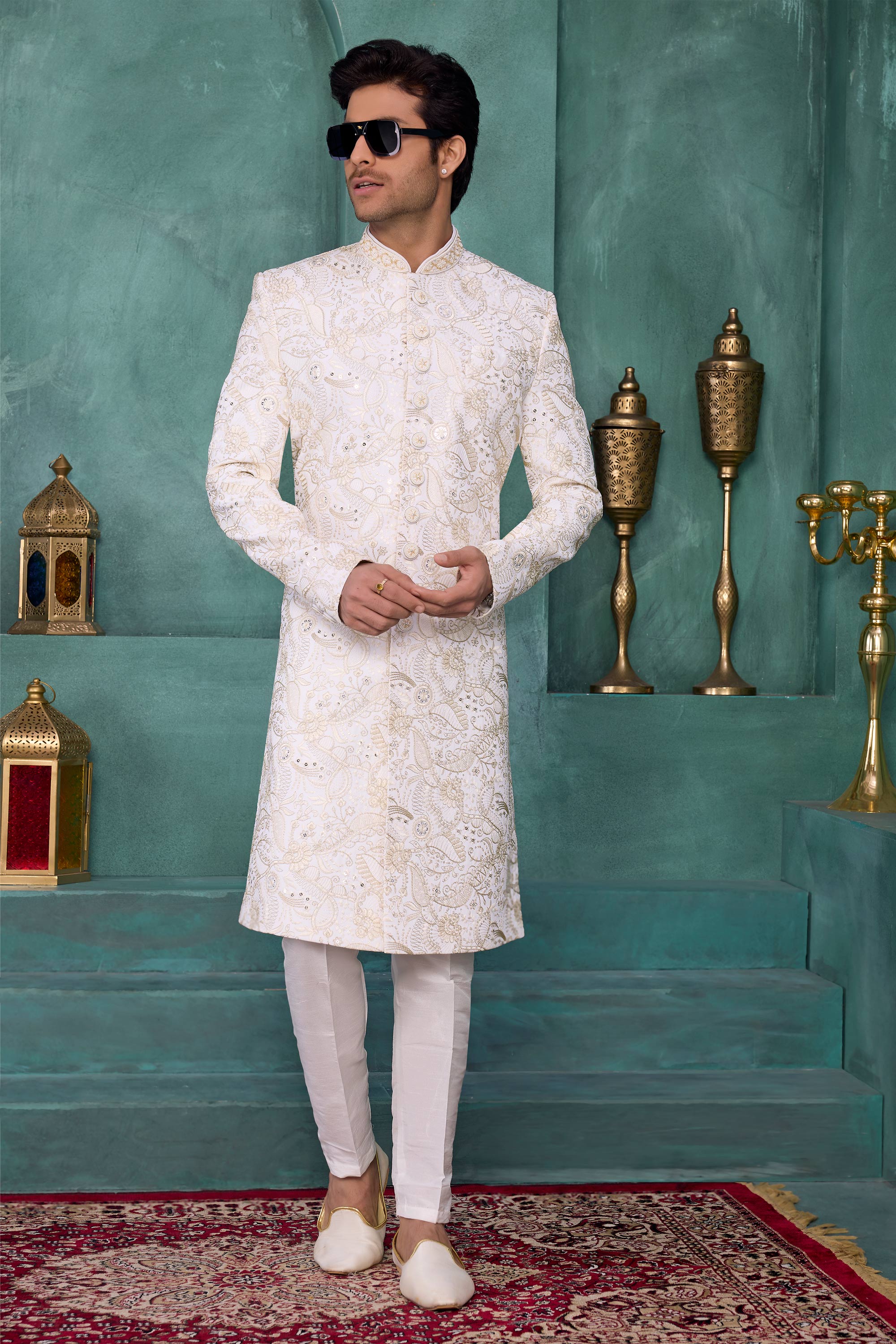 Make a grand impression with this premium Mens Wedding Sherwani, thoughtfully designed for festive occasions. The sherwani features computerized thread embroidery on Art Silk, giving it a rich and royal appeal. The classic Reach Color adds timeless charm to the attire. Due to digital photography, slight color variations may occur.