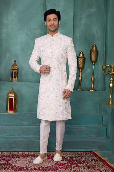 Cream Wedding Wear Art Silk Embroidered Readymade Sherwani For Men