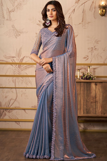 Creative Lace Work Lavender Color Satin Saree With Heavy Embroidered Blouse