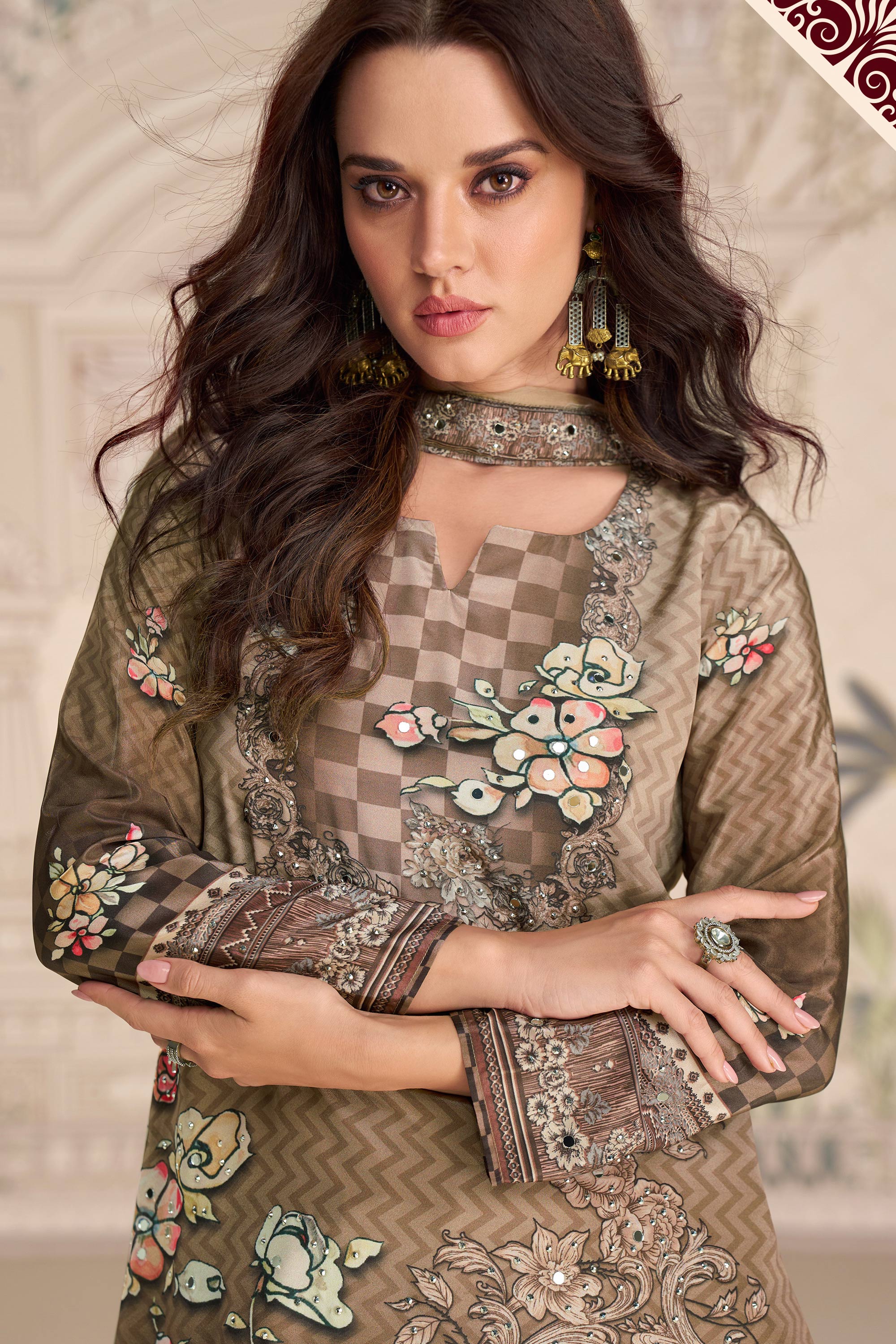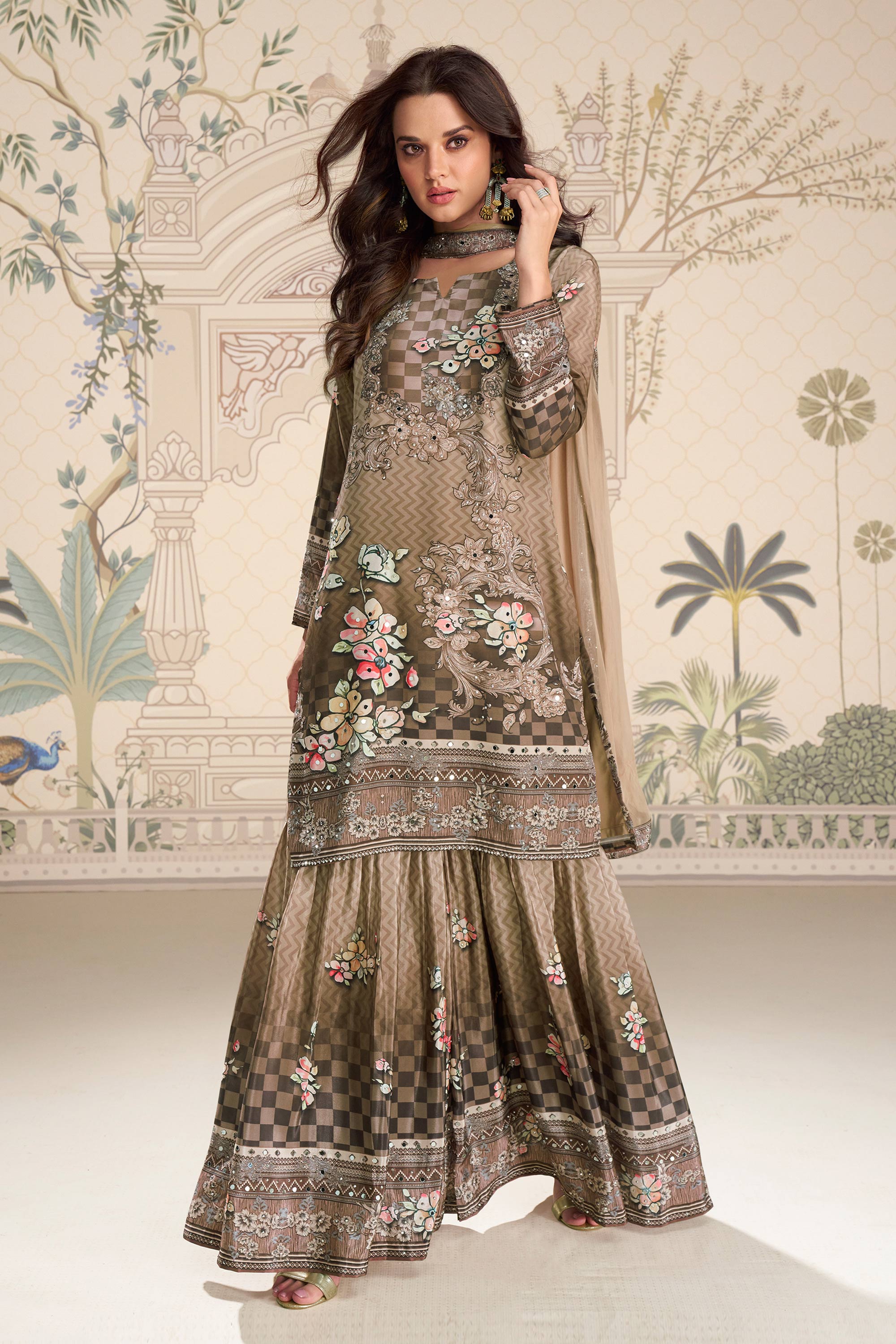 Crepe Fabric Printed Brown Readymade Palazzo Suit For Festive Wear