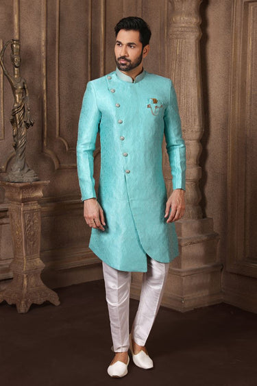 Cyan Color Jacquard Silk Fabric Reception Wear Readymade Indo Western For Men
