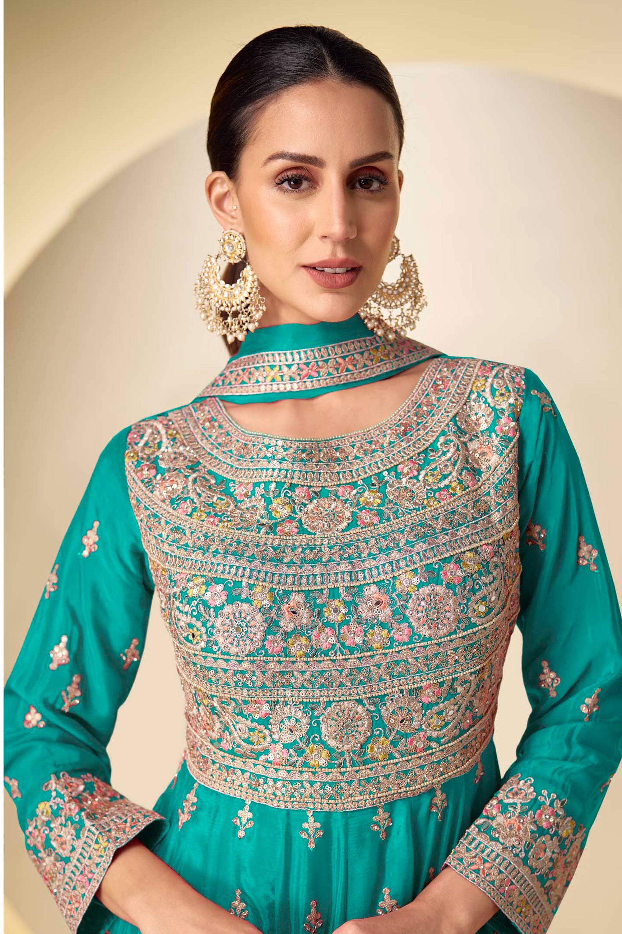 Cyan Embroidered Chinon Readymade Anarkali Style Suit