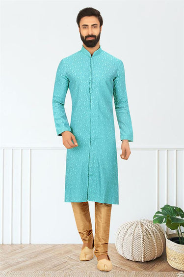 Cyan Jacquard Graceful Readymade Men Kurta Pyjama For Festive Wear