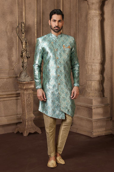 Cyan Jacquard Silk Fabric Sangeet Wear Readymade Indo Western For Men