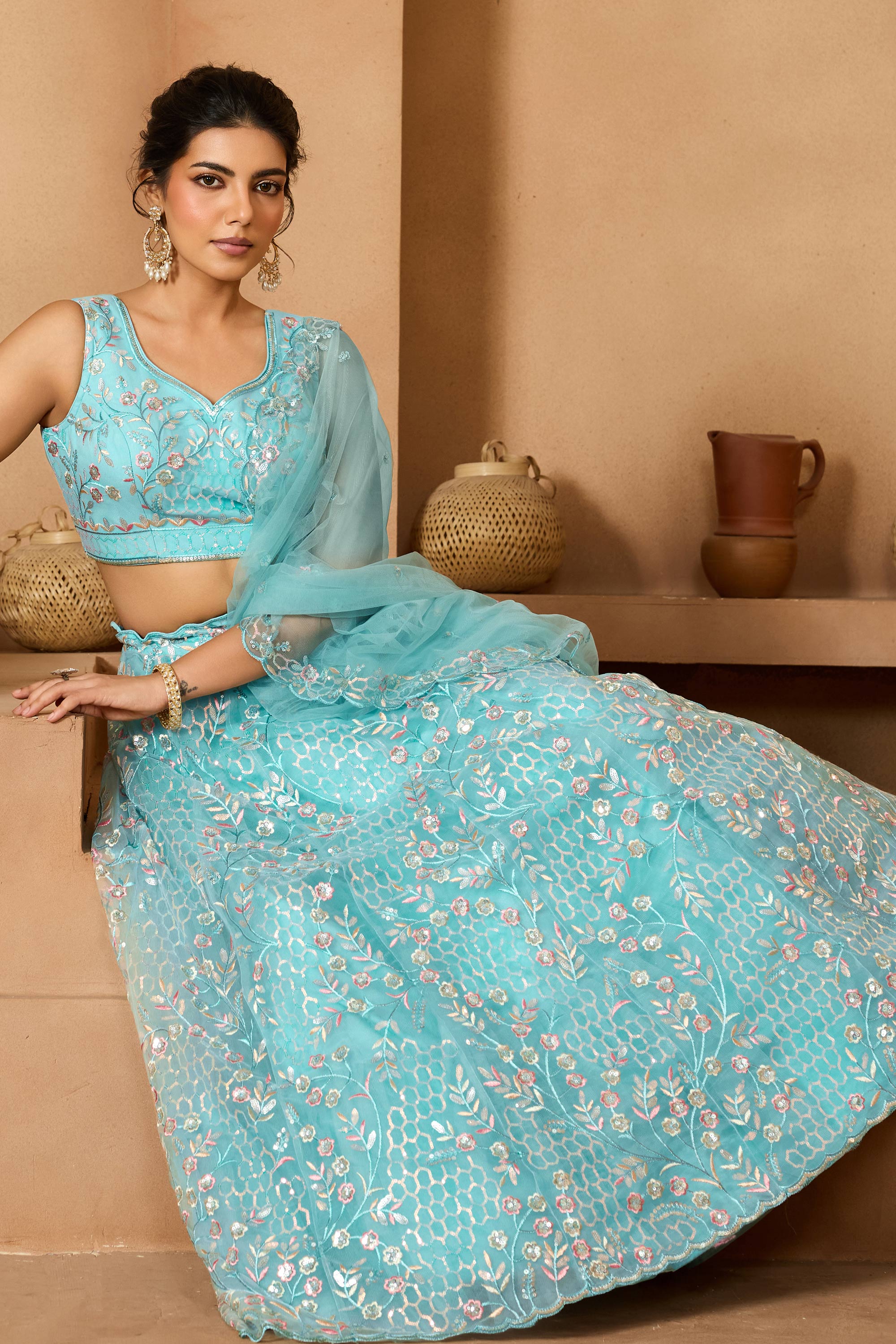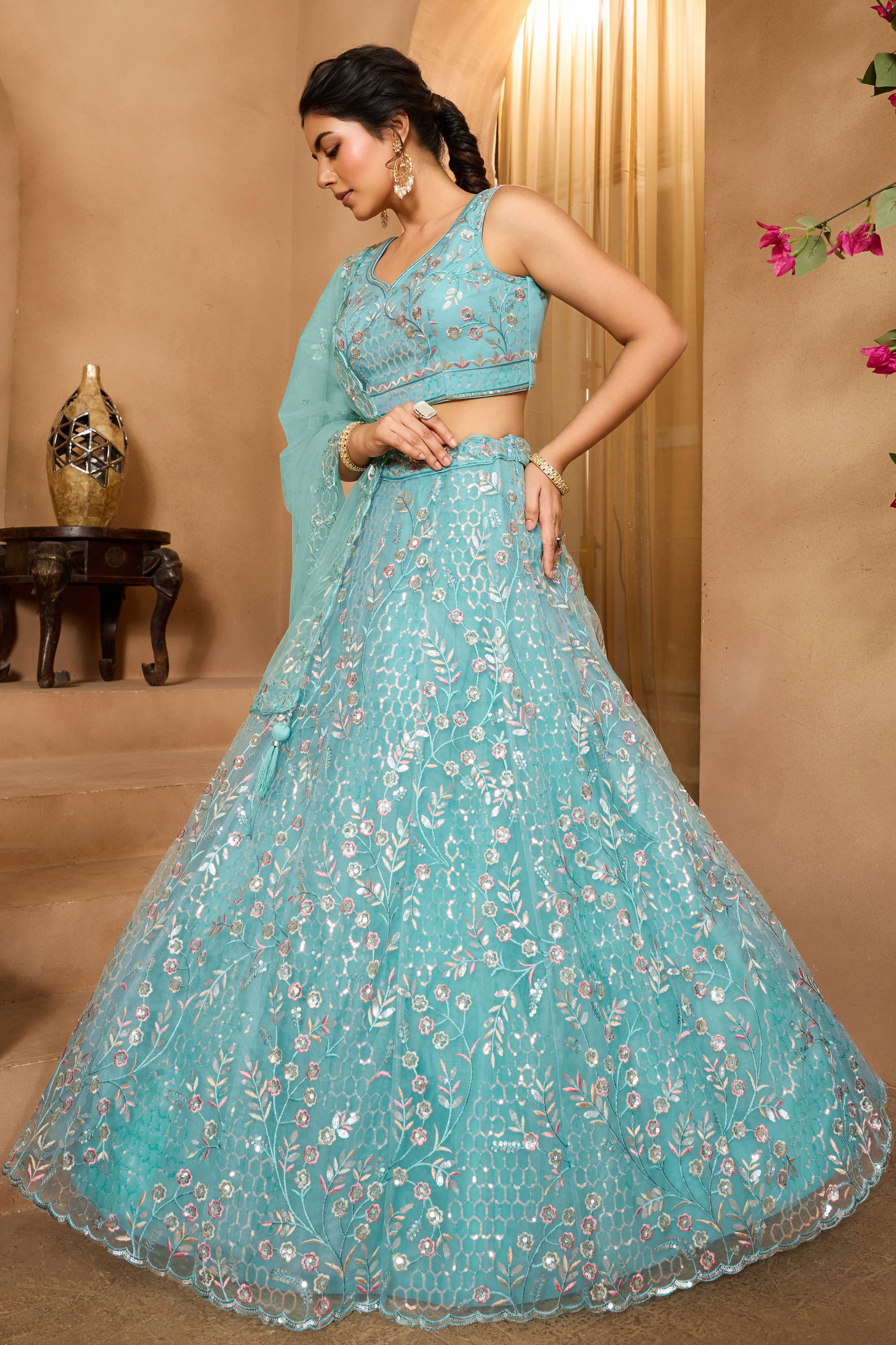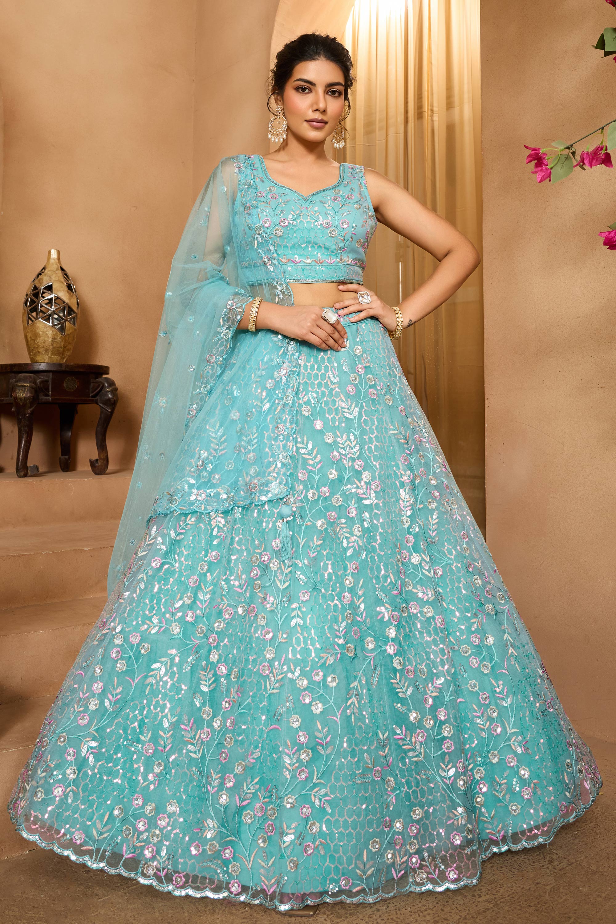 Cyan Wedding Wear Net Fabric Lehenga Choli With Dupatta