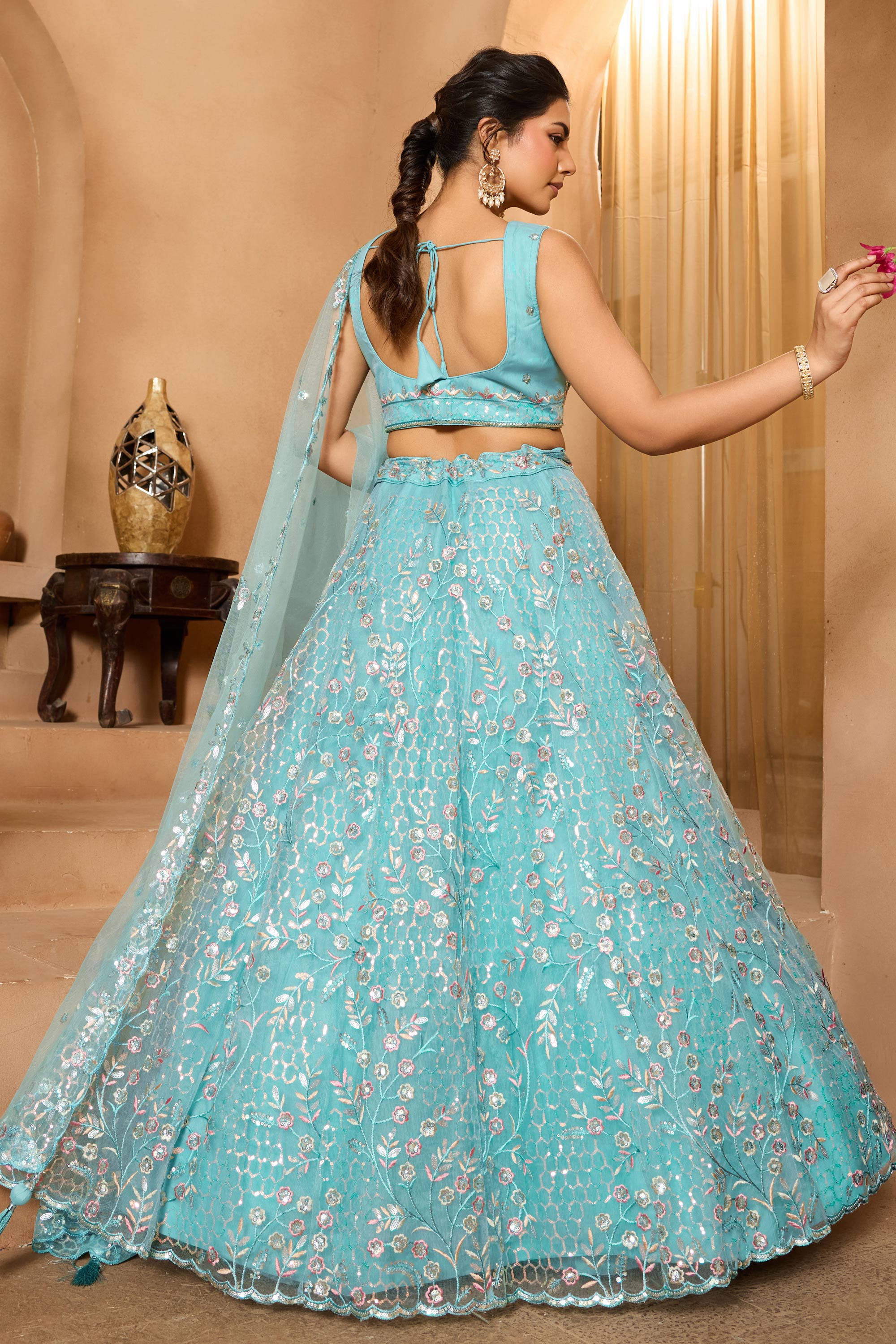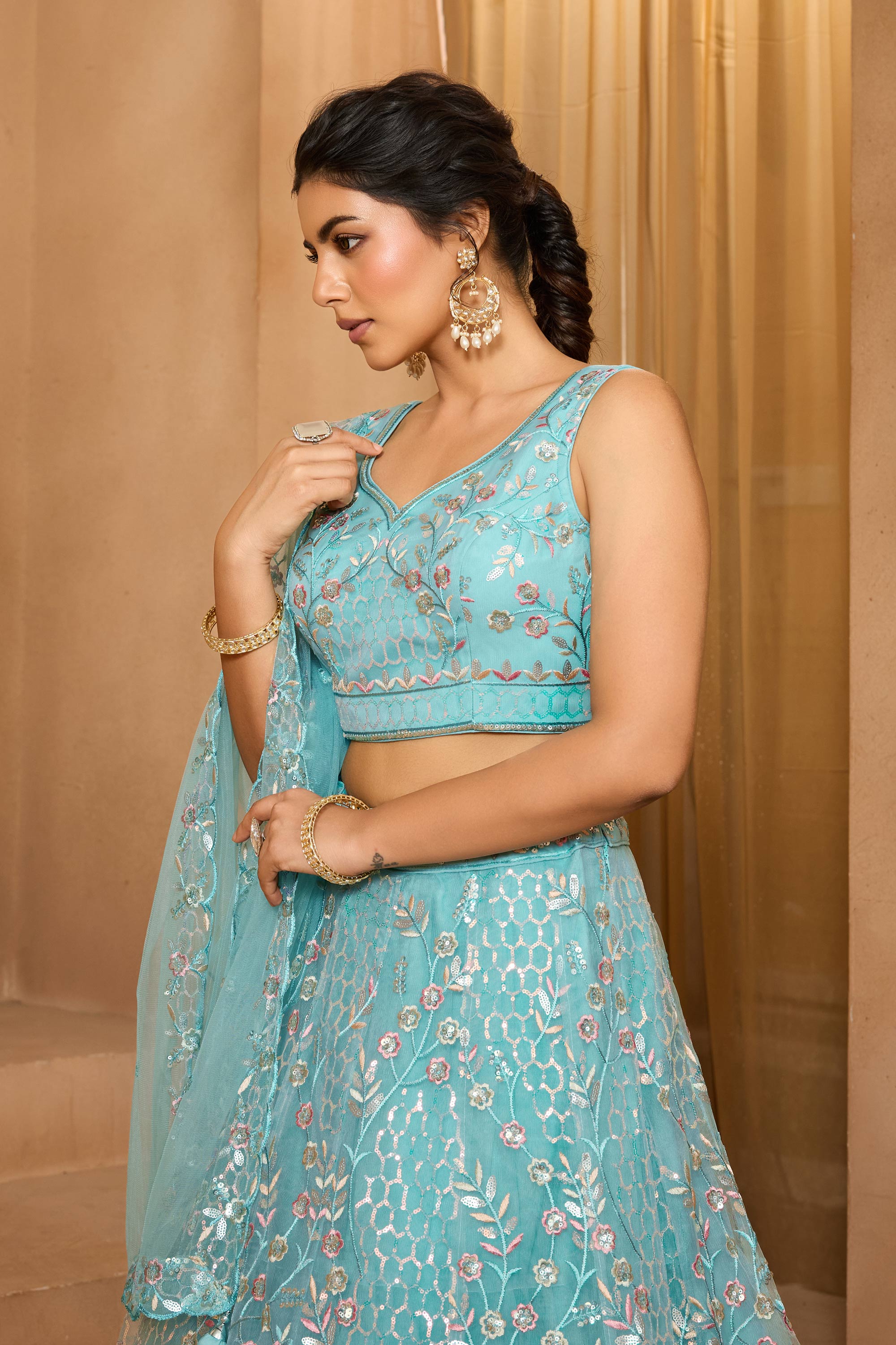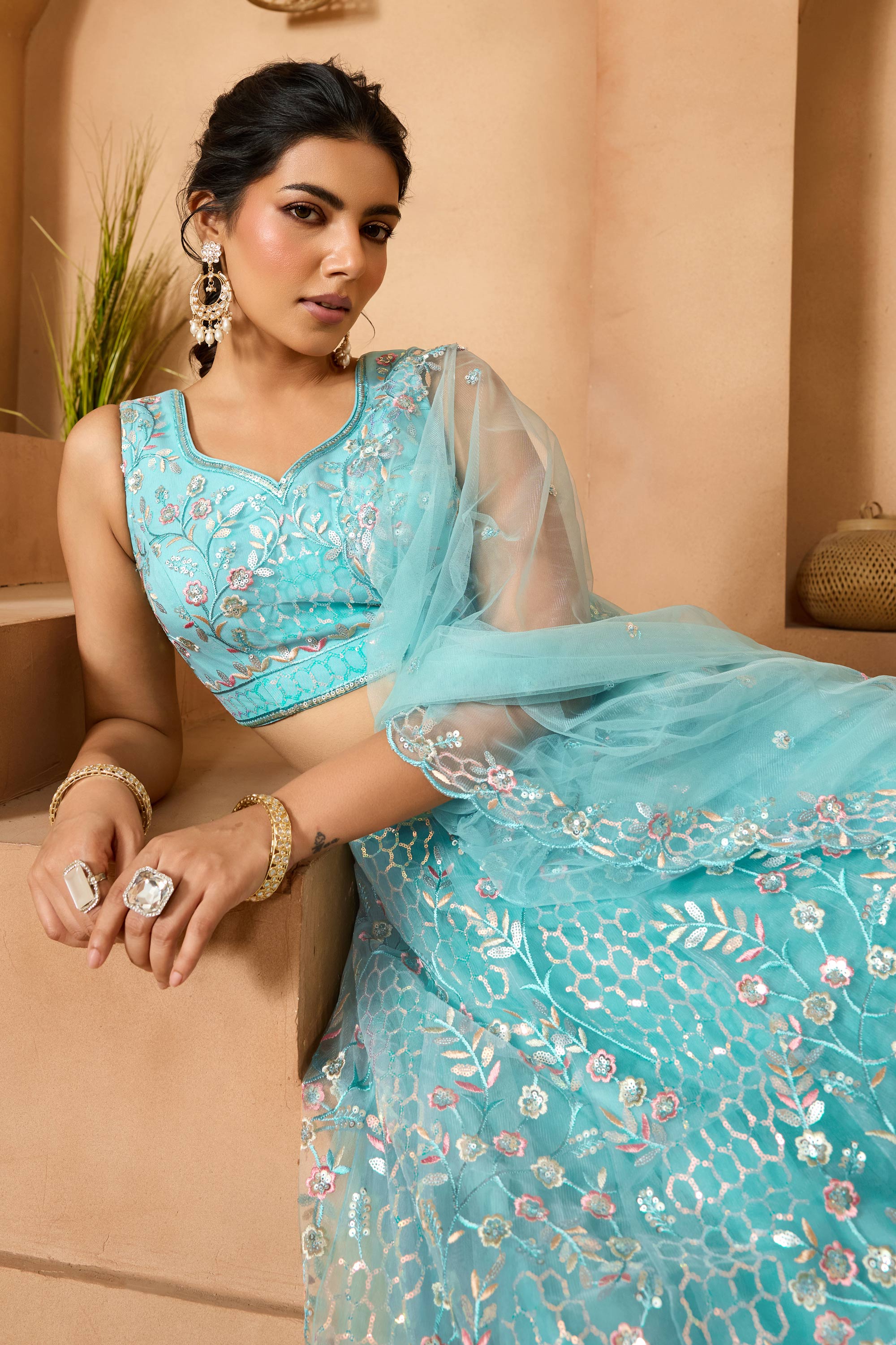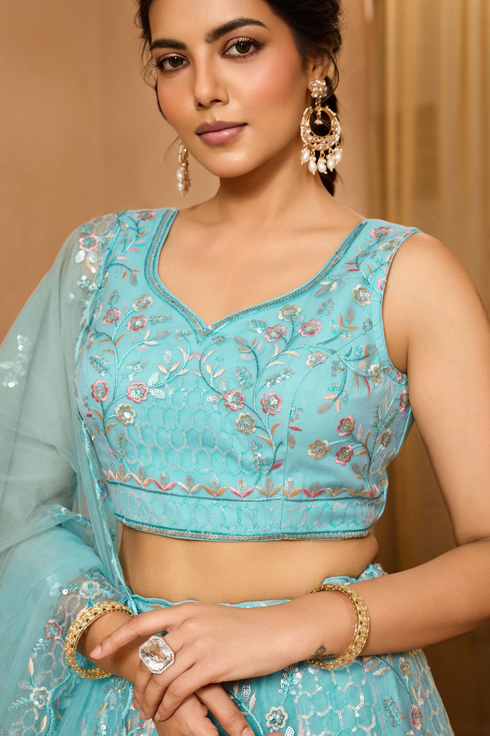 Cyan Wedding Wear Net Fabric Lehenga Choli With Dupatta