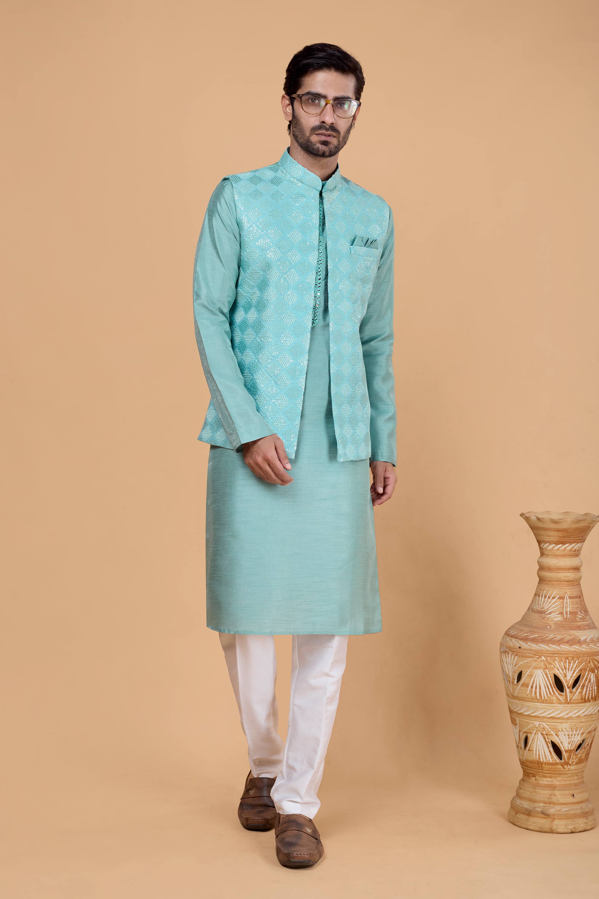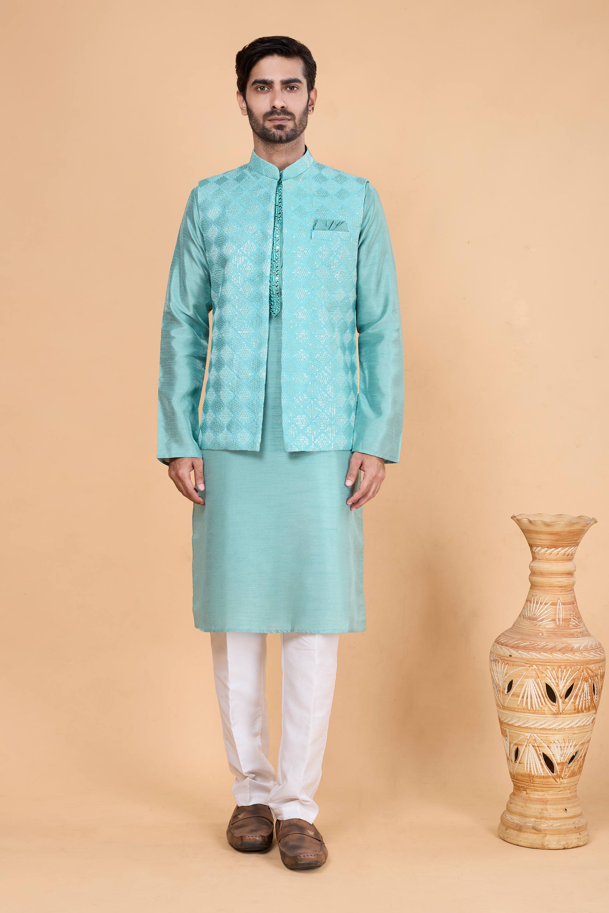 Upgrade your festive wardrobe with the Lovely Reach Color Wedding Function Designer Readymade Mens 3-Piece Kurta and Jacket with Aligadhi Pant. Tailored to perfection, this outfit combines cultural charm with a contemporary fit, ensuring you feel confident and stylish at every event. The high-quality materials used in the kurta, jacket, and pants ensure a smooth fit and comfort all day long. Designed for wedding functions, festive occasions, or formal family gatherings, it blends traditional and modern fashion effortlessly. Impress everyone with this standout attire, designed to reflect both elegance and personality. Add it to your wardrobe now.