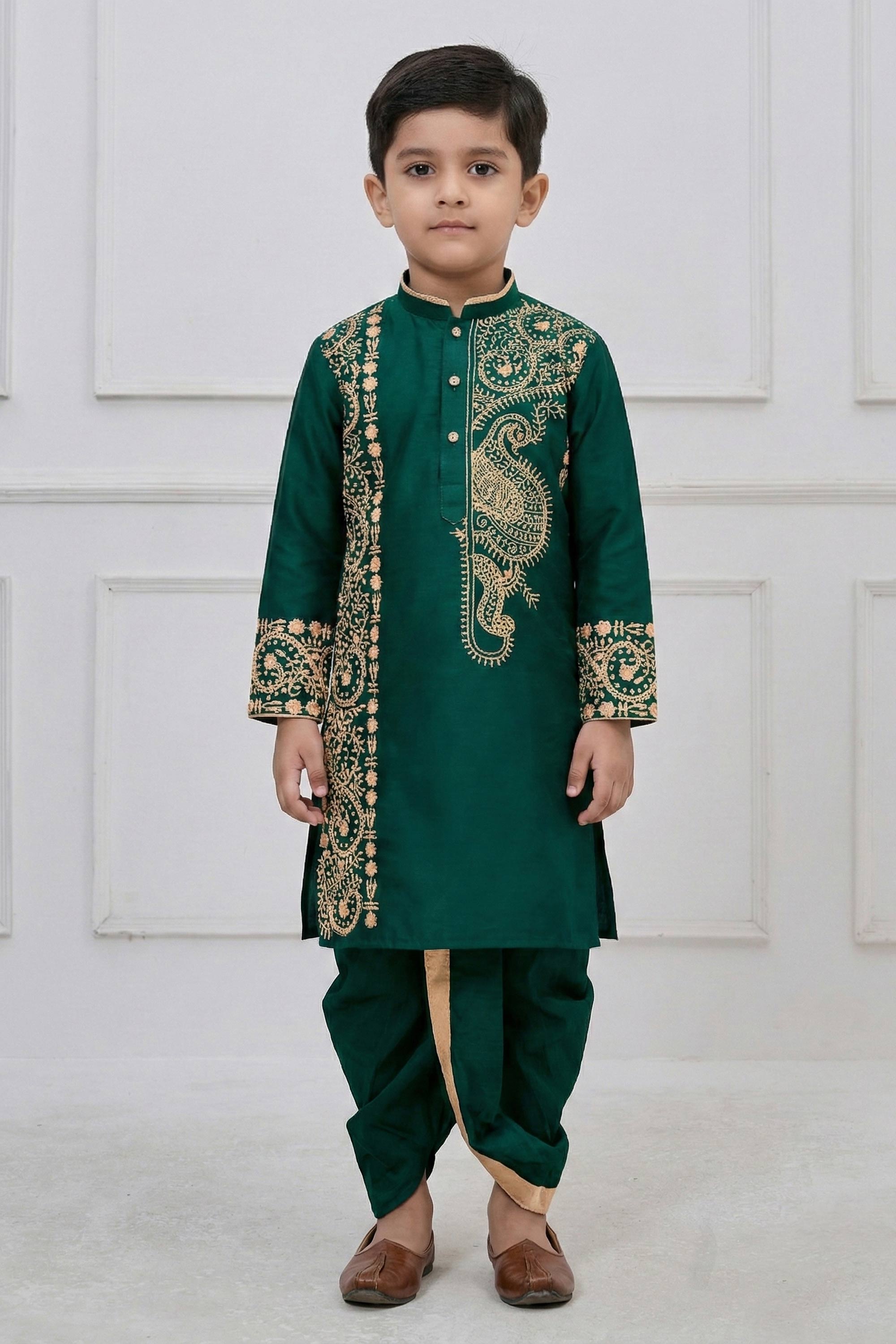 Dark Green Festive Wear Viscose Embroidered Readymade Kurta With Dhoti For Boys