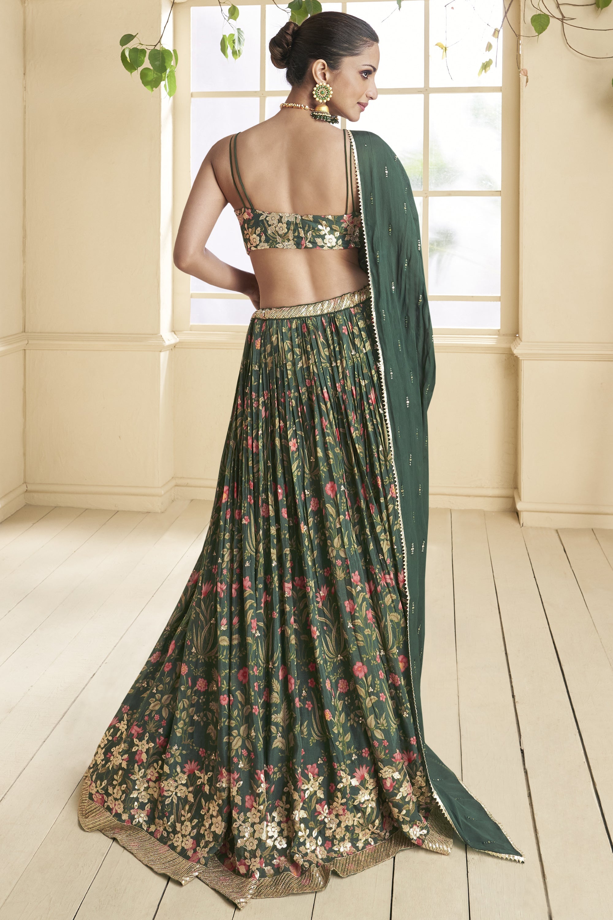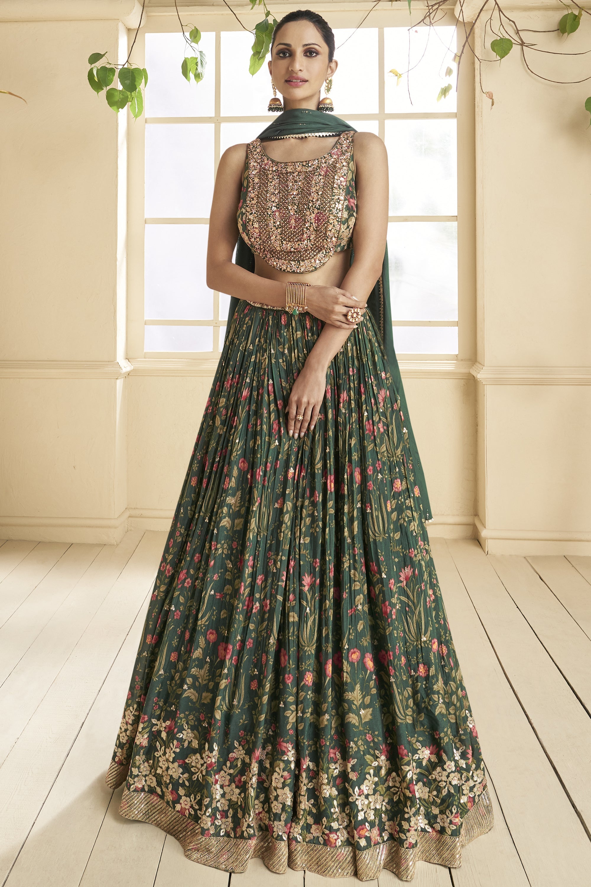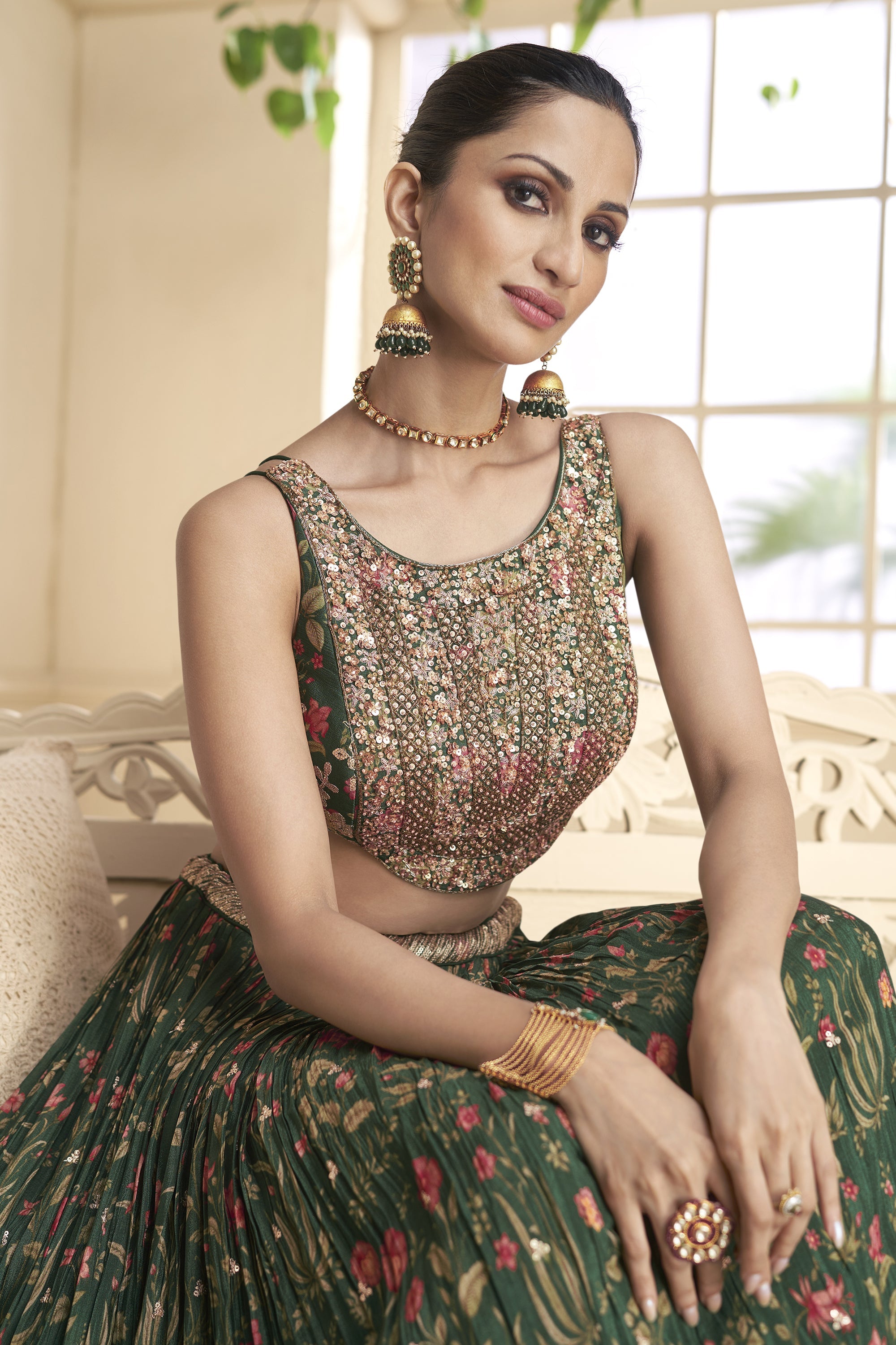Dark Green Georgette Reception Wear 3 Piece Readymade Lehenga With Printed And Embellished Blouse