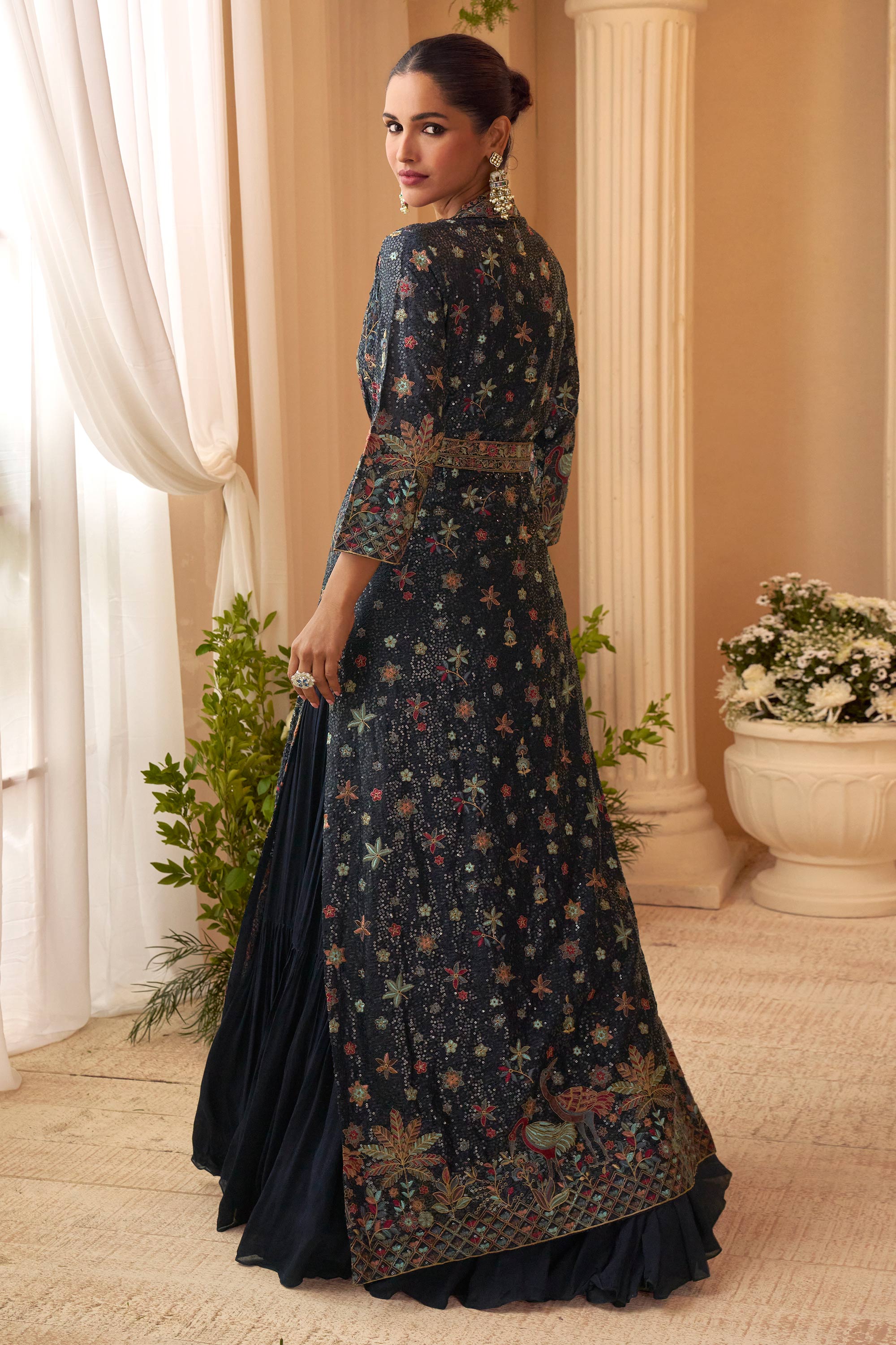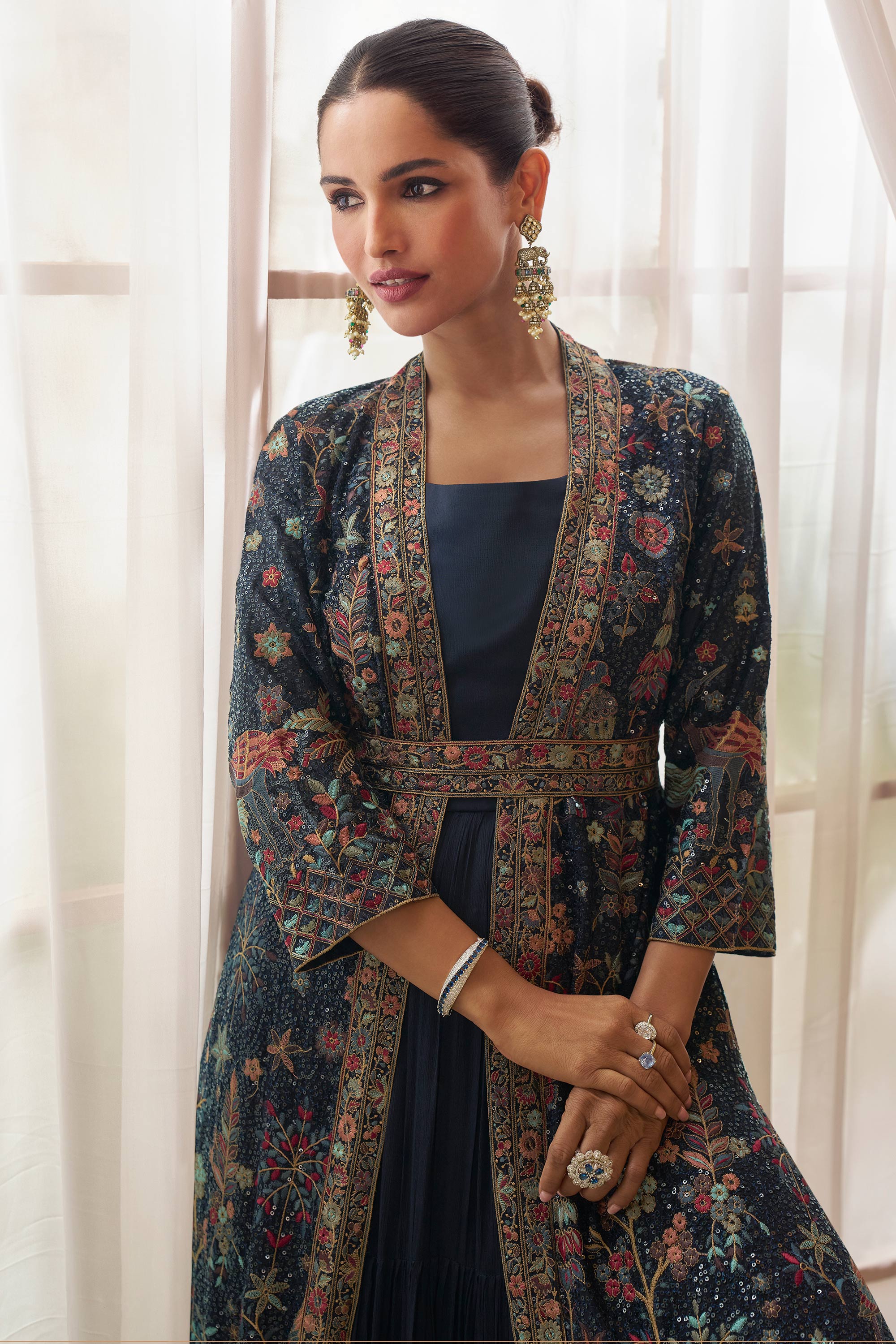 Designer Navy Blue Floor Touch Embroidered Gown With Long Jacket