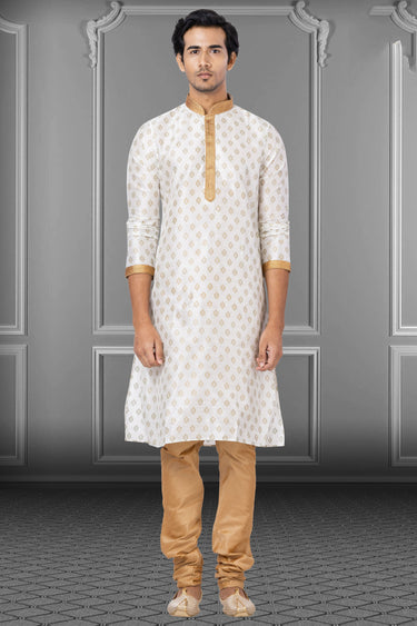 Dhupion Fabric White Wedding Wear Readymade Designer Men Kurta Pyjama
