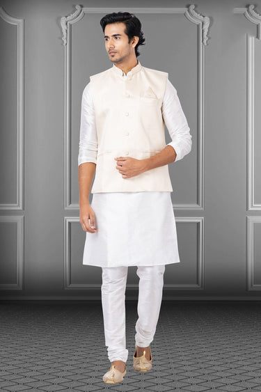 Dhupion Raw Silk Stunning White Function Wear Readymade Men Kurta Pyjama With Jacket