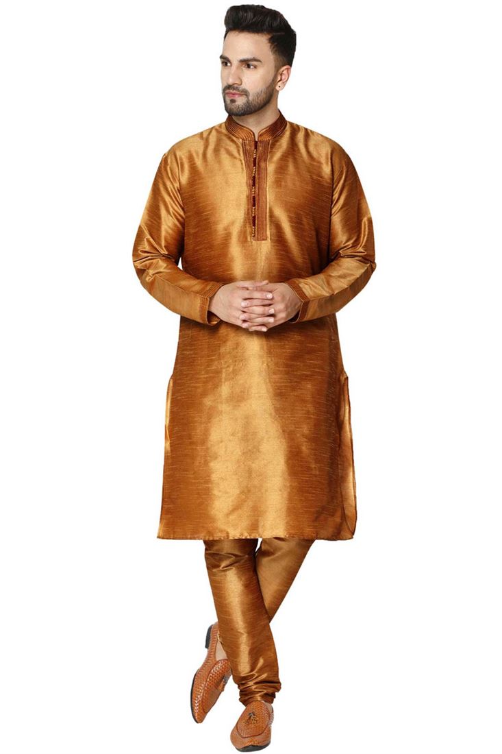 Dhupion Silk Fabric Dark Beige Color Festival Wear Kurta Pyjama For Men