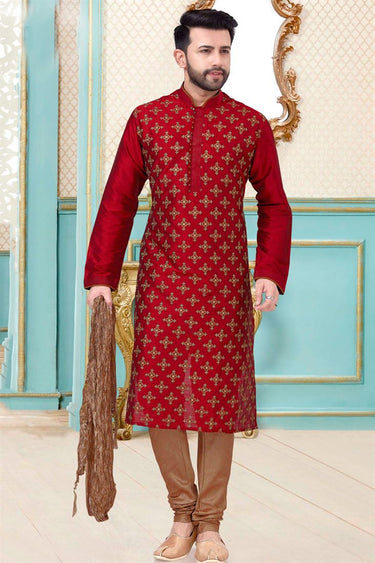 Dhupion Silk Fabric Embroidered Work Kurta Pyjama For Men In Red Color