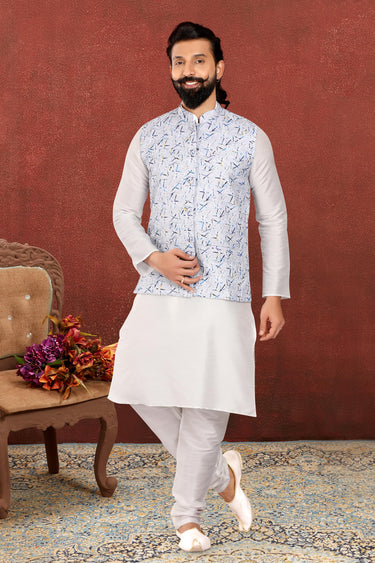 Dhupion Silk White Function Wear Readymade Glamorous Kurta Pyjama For Men With Jacket