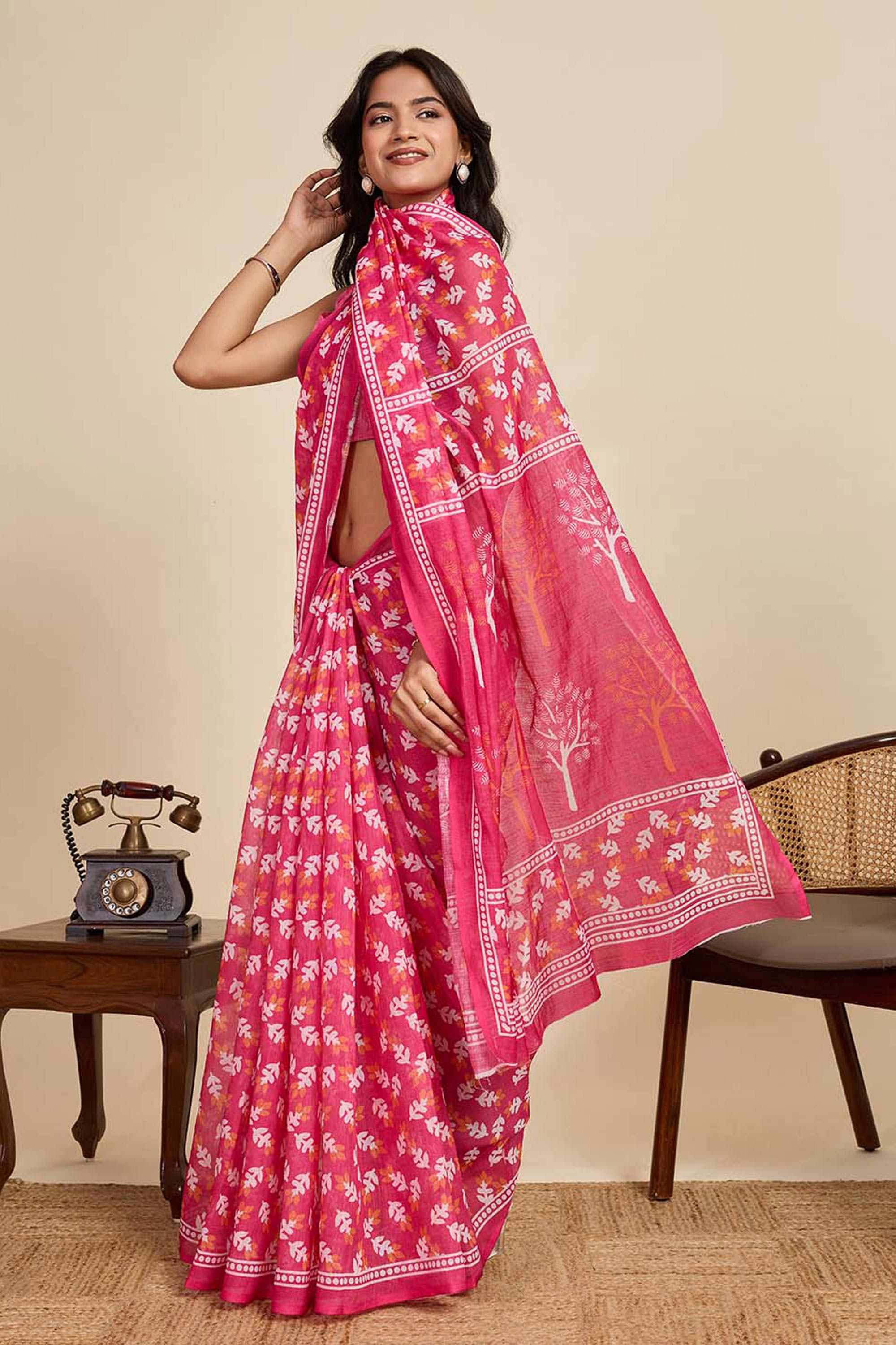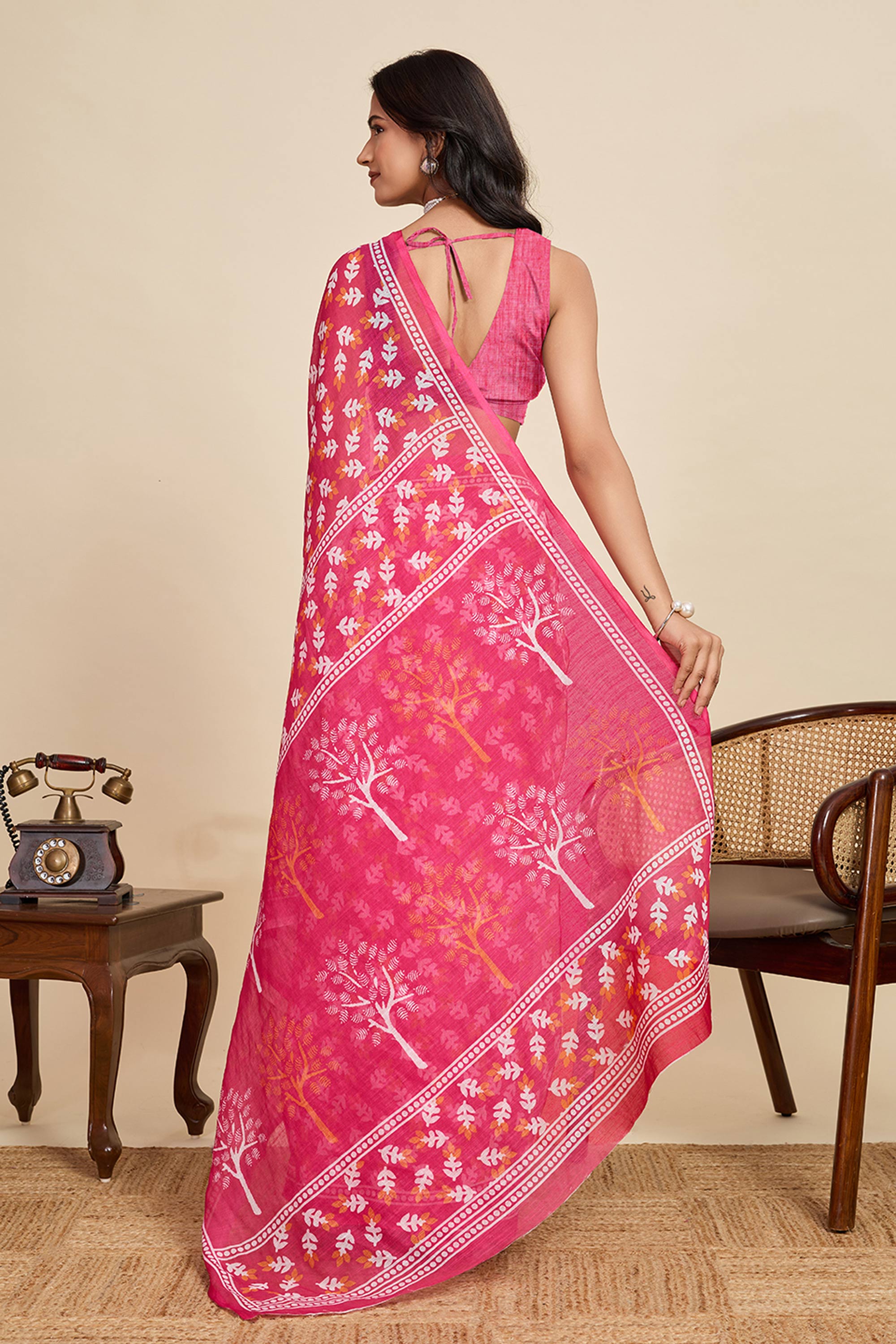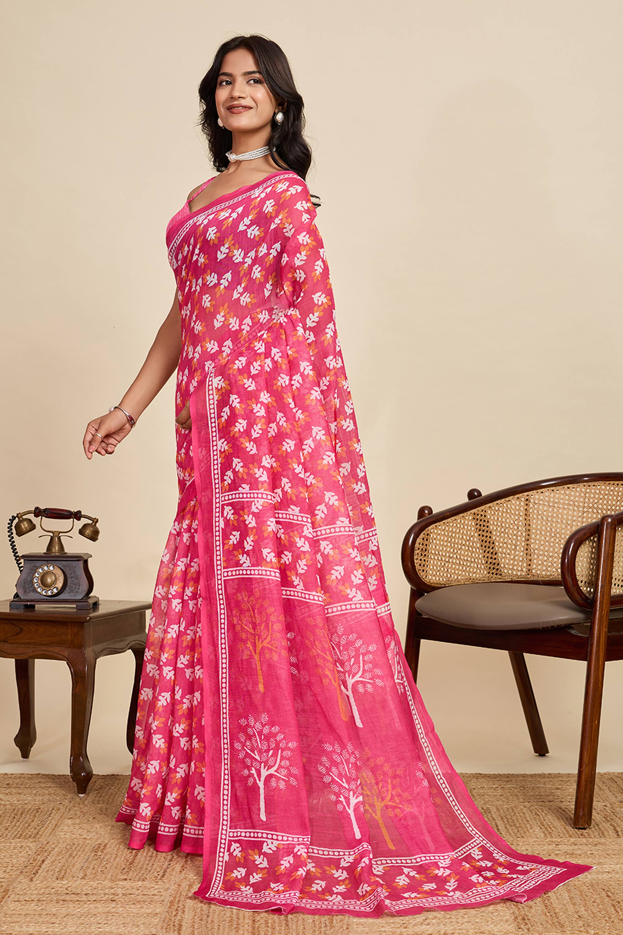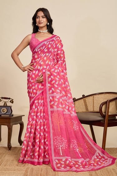 Digital Printed Linen Pink Saree For Casual Wear