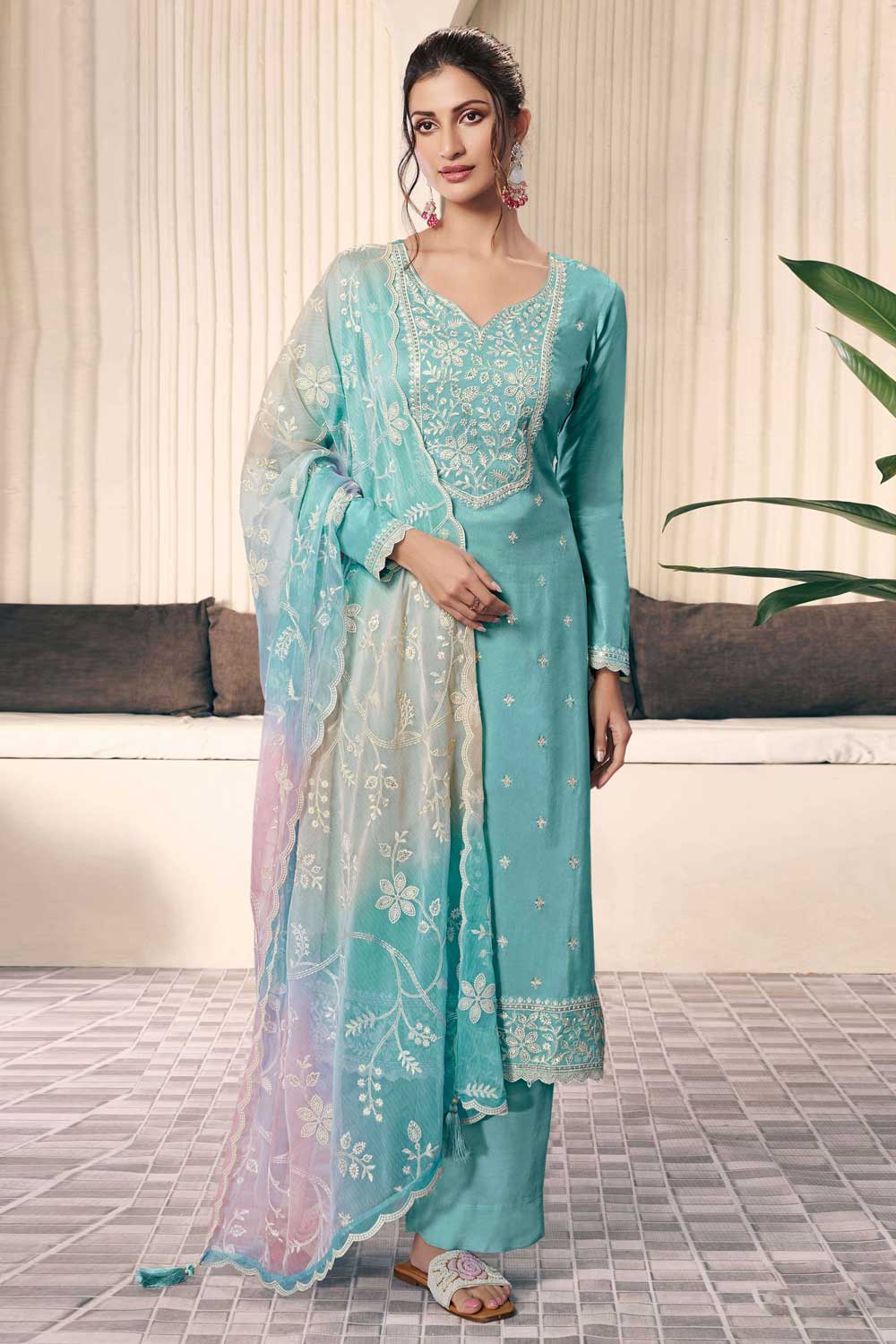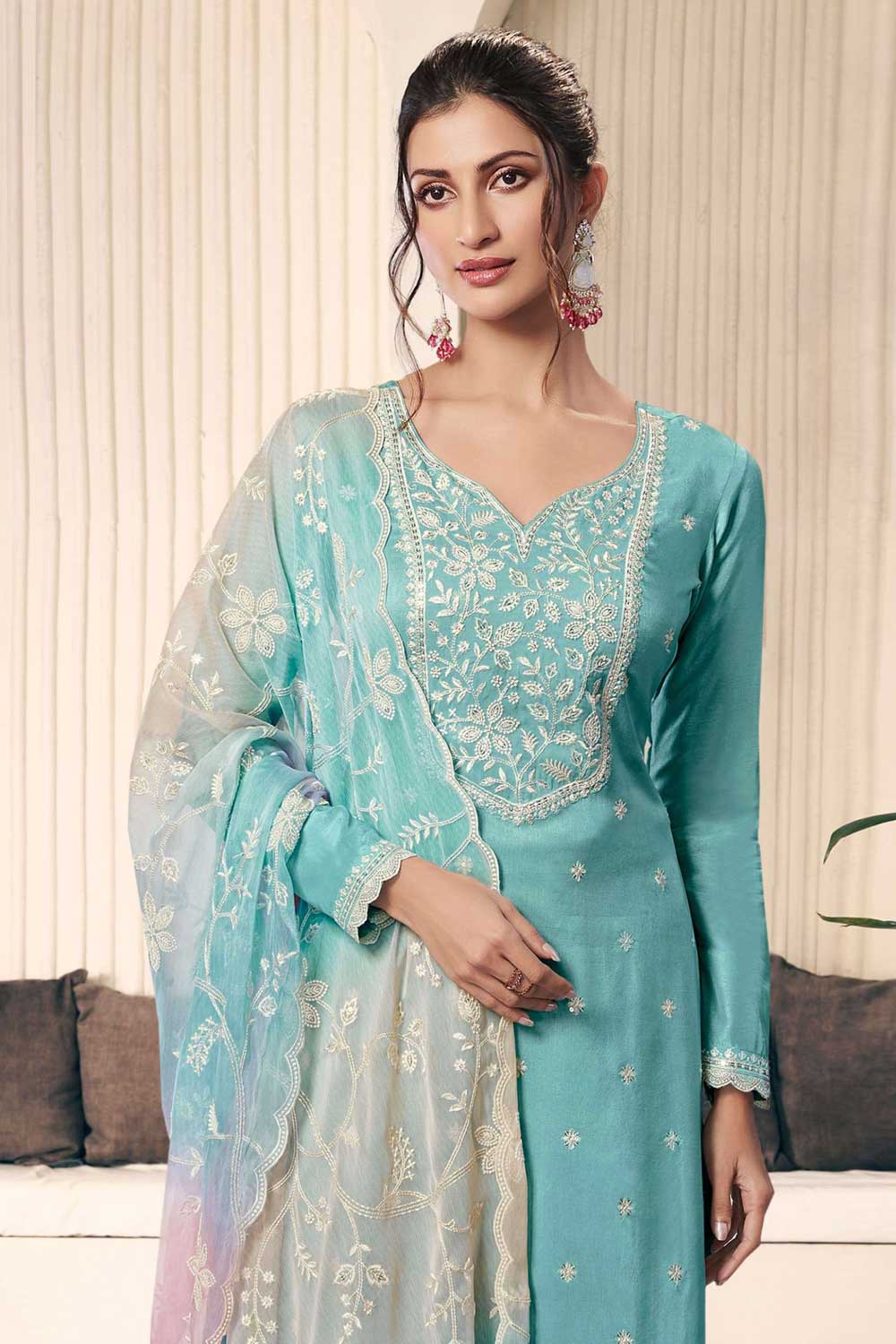 Diksha Singh Art Silk Fabric Beatific Palazzo Suit In Cyan Color