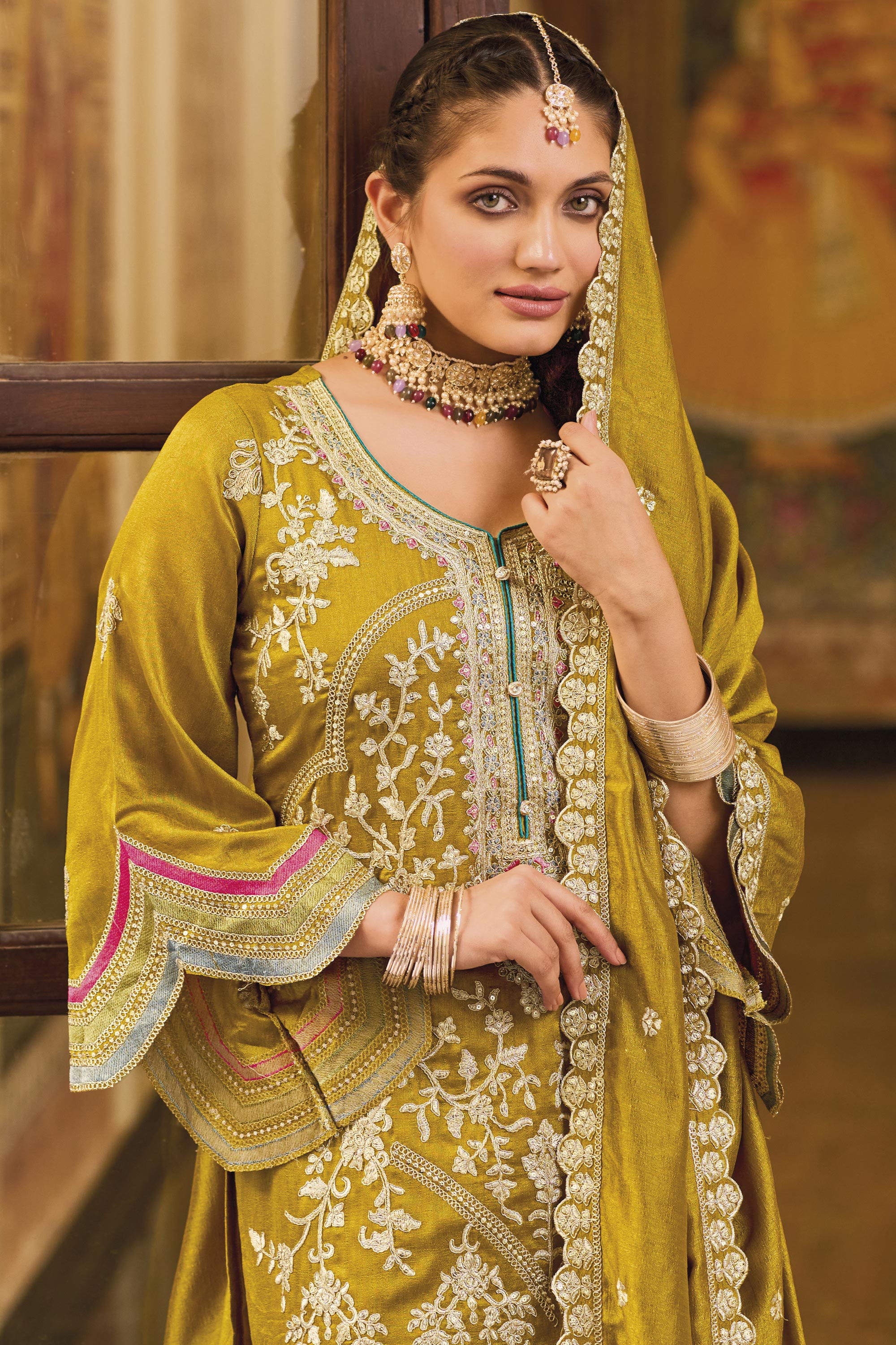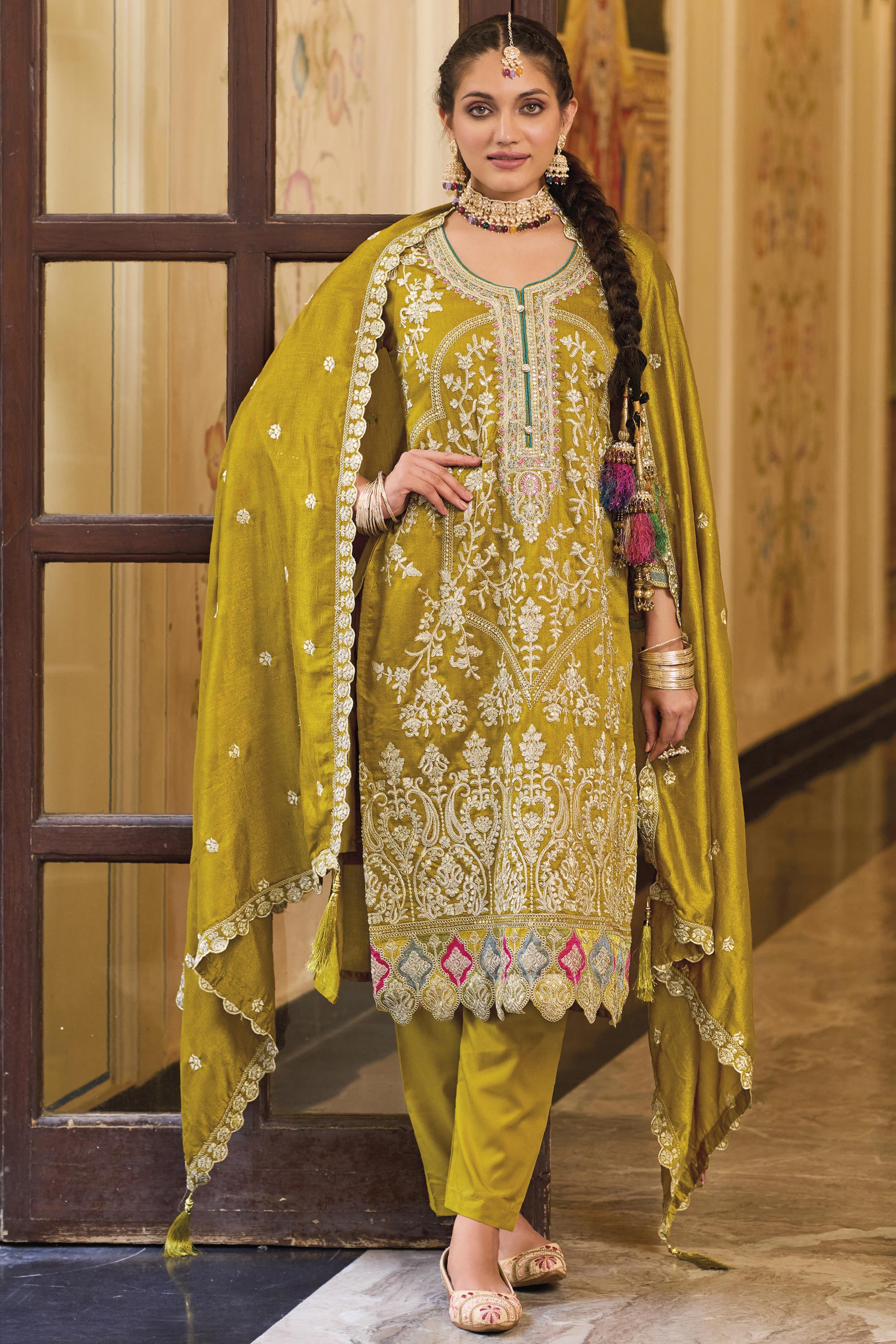 Diwali Special Mustard Color Embroidered Readymade Designer Salwar Suit In Art Silk Fabric
