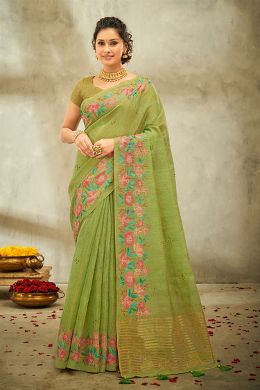 Elegant Linen Fabric Floral Embroidered Saree in Green Color