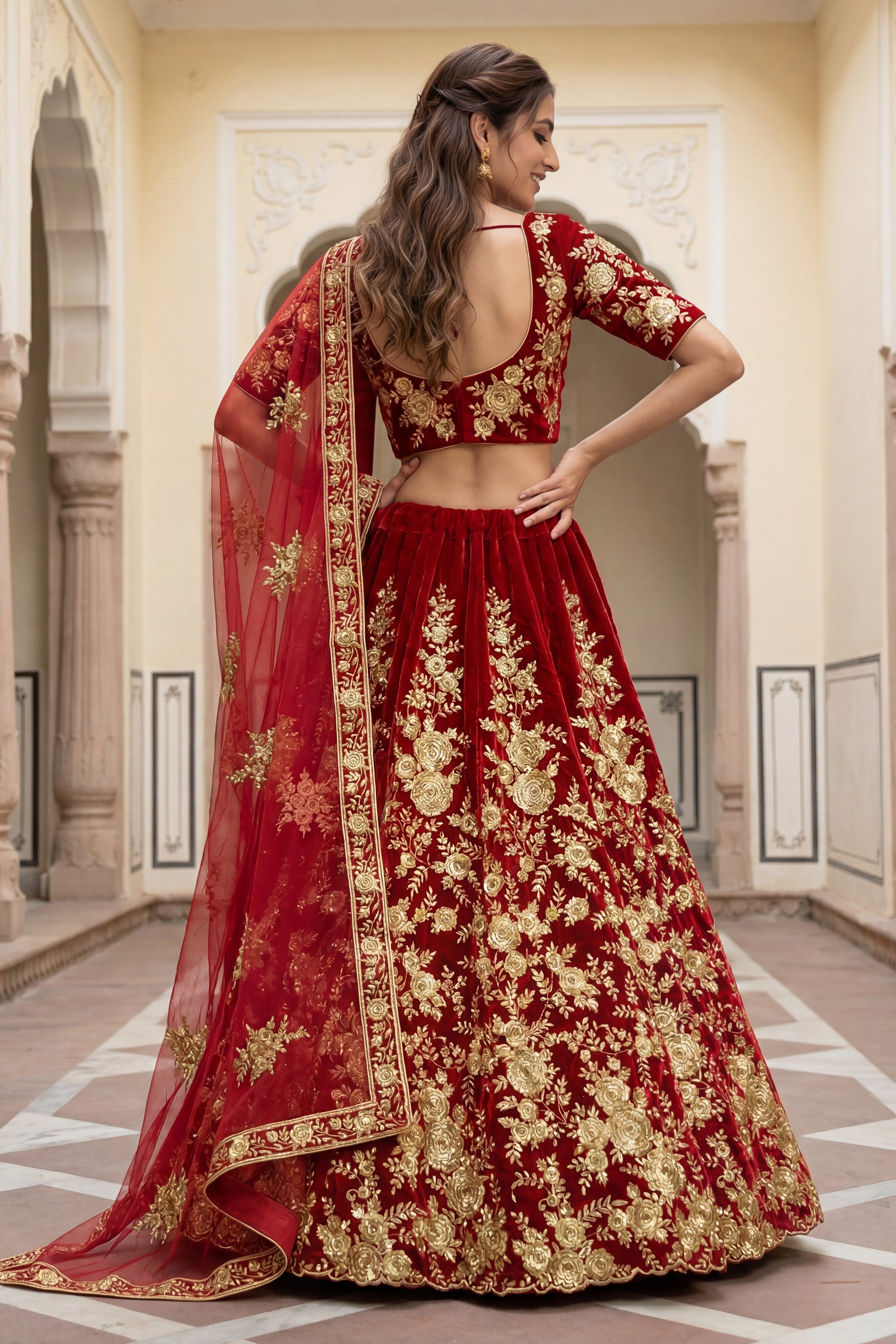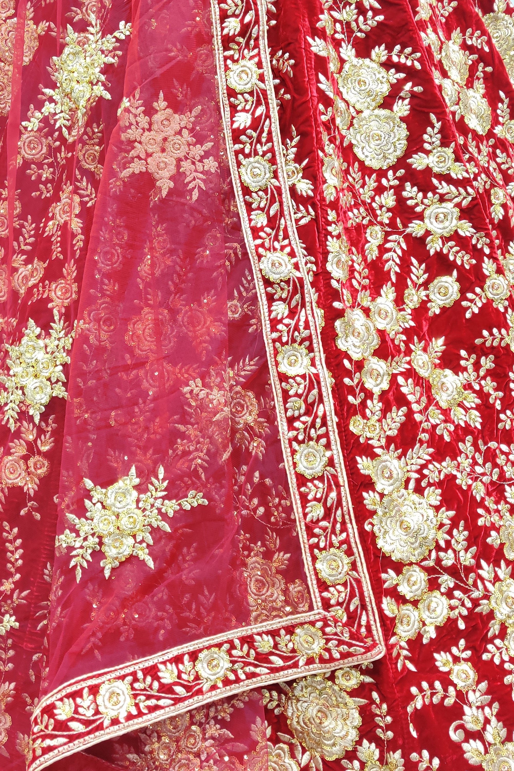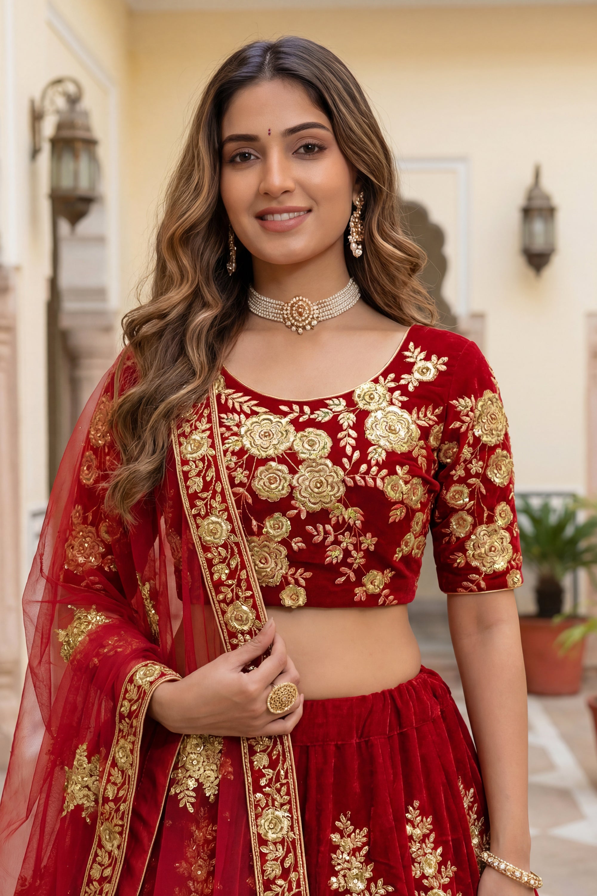 Elegant Red Traditional Bridal Look Designer Velvet Lehenga Choli