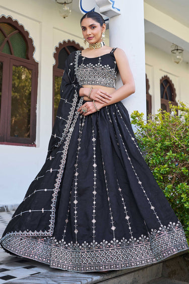 Embroidered Black Art Silk Sangeet Wear Lehenga Choli