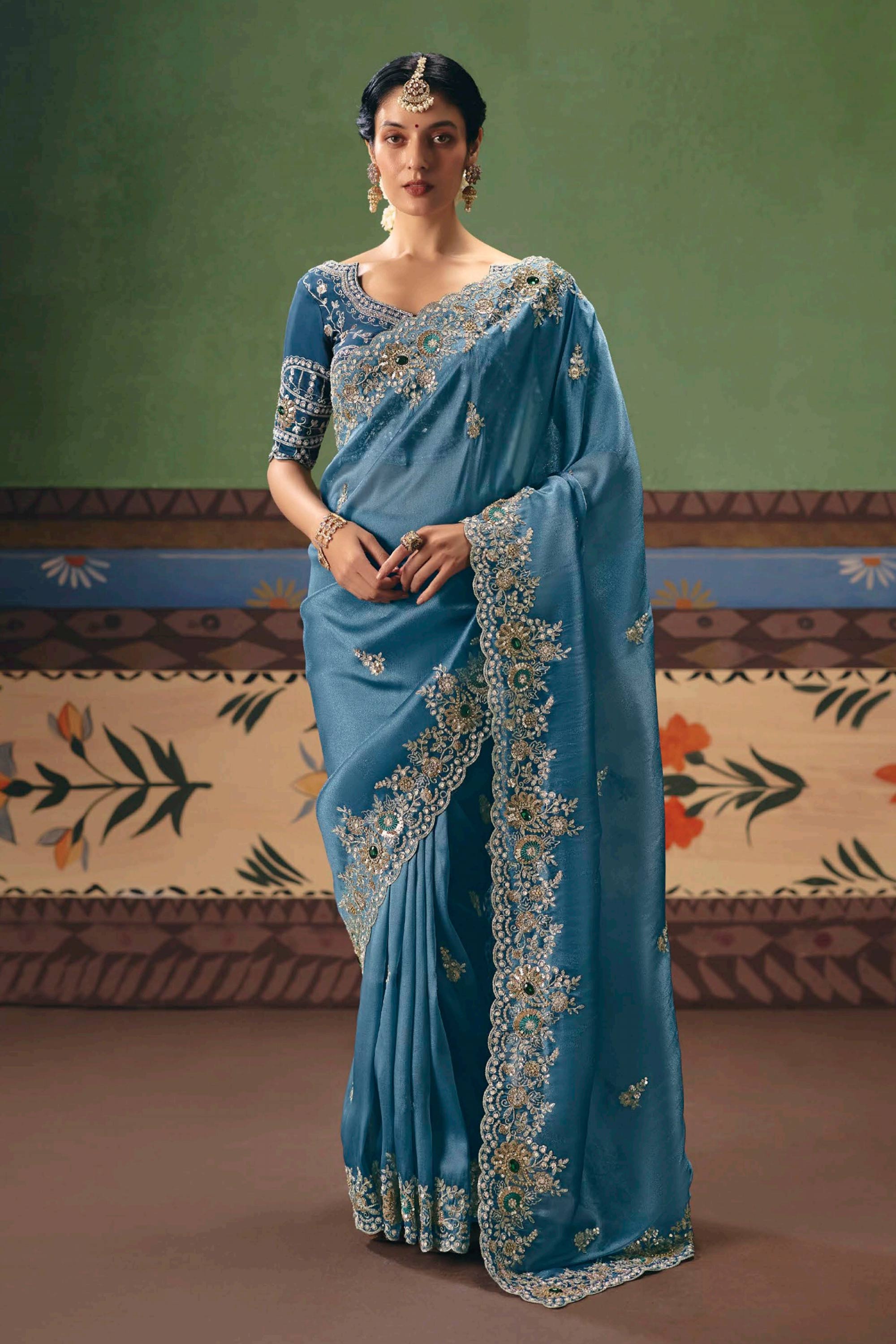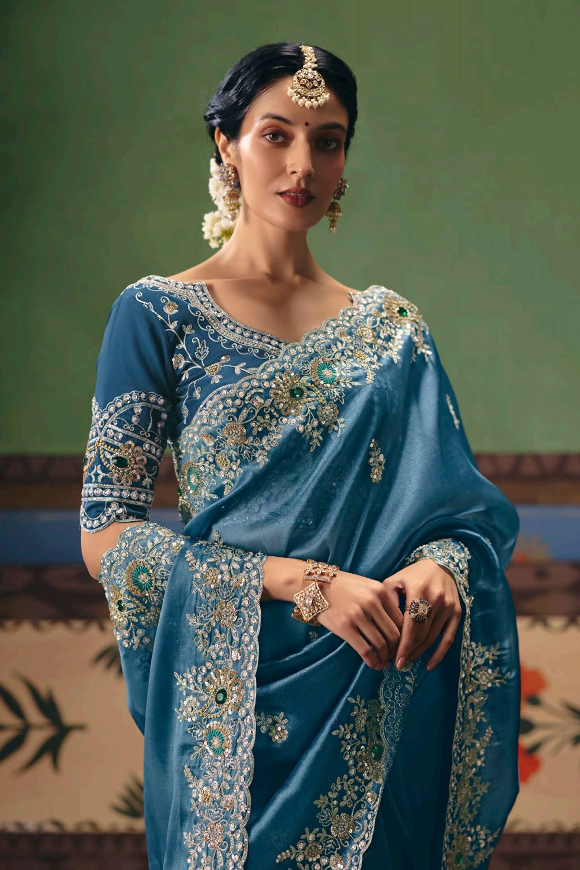 Embroidered Border Work Art Silk Cyan Saree For Function Wear