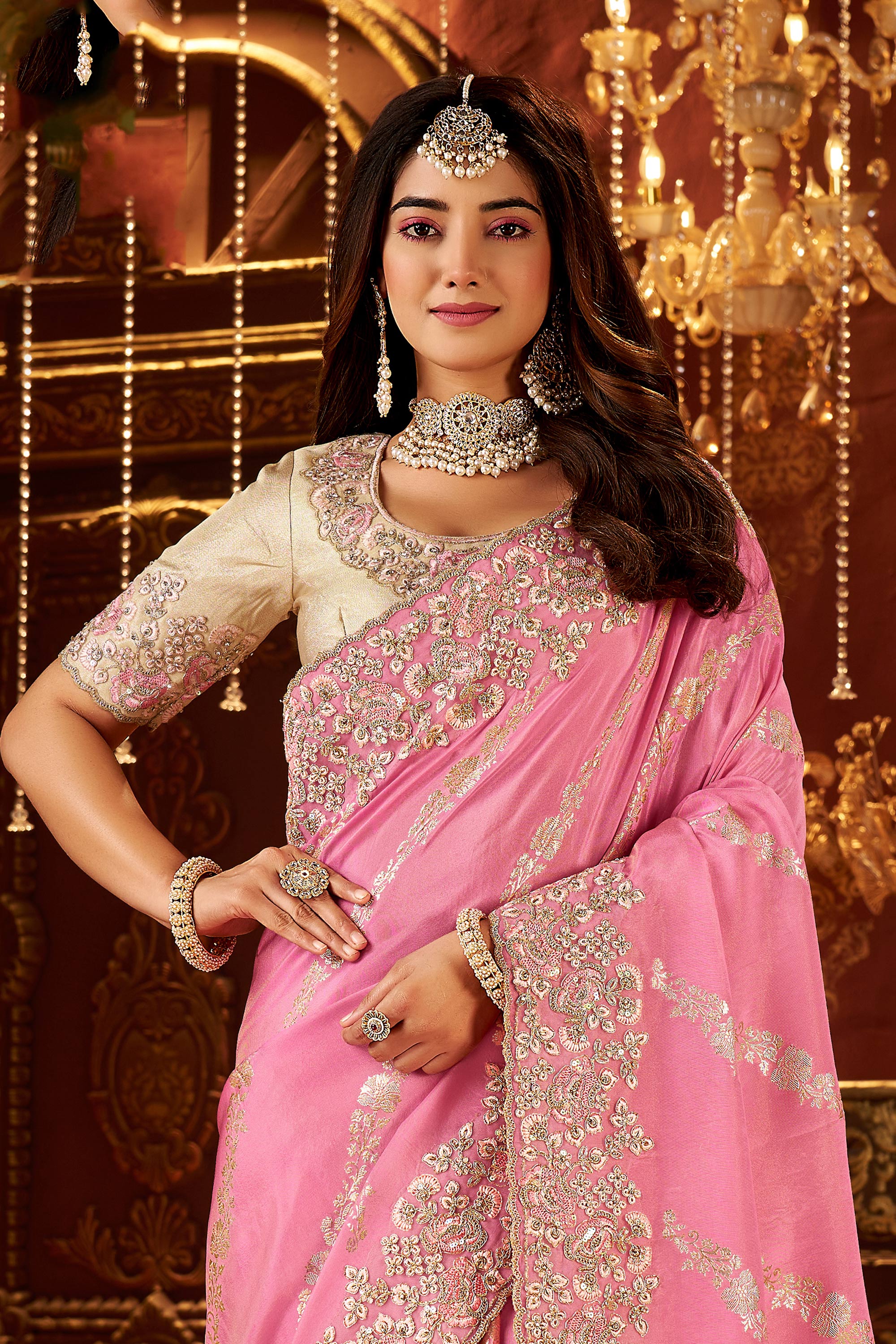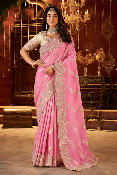 Embroidered Border Work Pink Art Silk Wedding Wear Saree