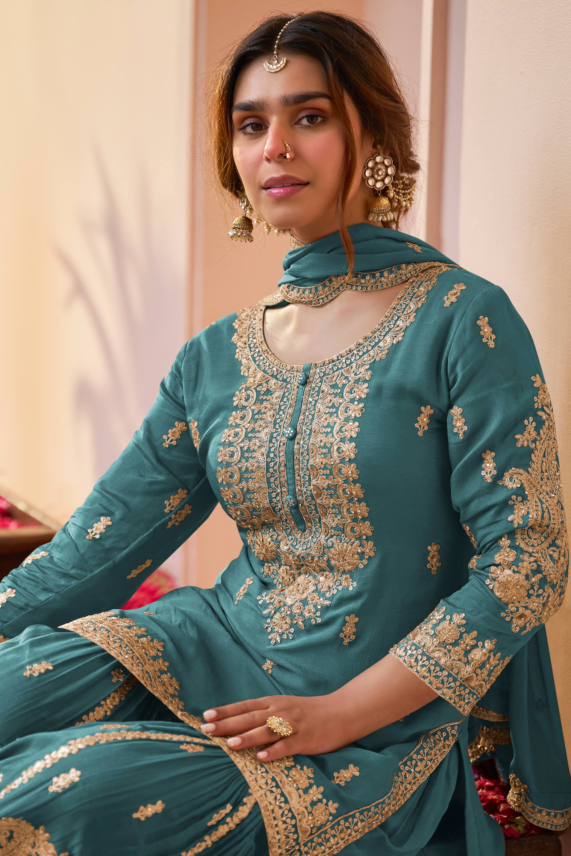 Step into elegance with the Chinon Embroidered Dark Beige Designer Sharara Style Palazzo Salwar Kameez. Crafted from premium Chinon fabric, this attire exudes charm with its detailed embroidery and contemporary palazzo style. Perfect for weddings, festive gatherings, or special events, it blends traditional grace with modern aesthetics. The dark beige hue enhances its timeless appeal, ensuring you stand out at any occasion. Lightweight yet luxurious, this ensemble is designed for comfort and style. Pair it with statement jewelry and heels for a flawless look that speaks of refined sophistication.