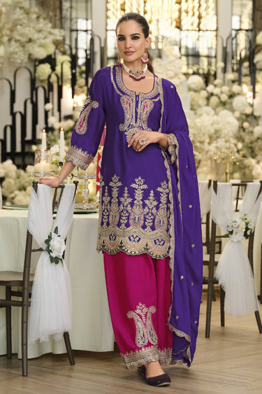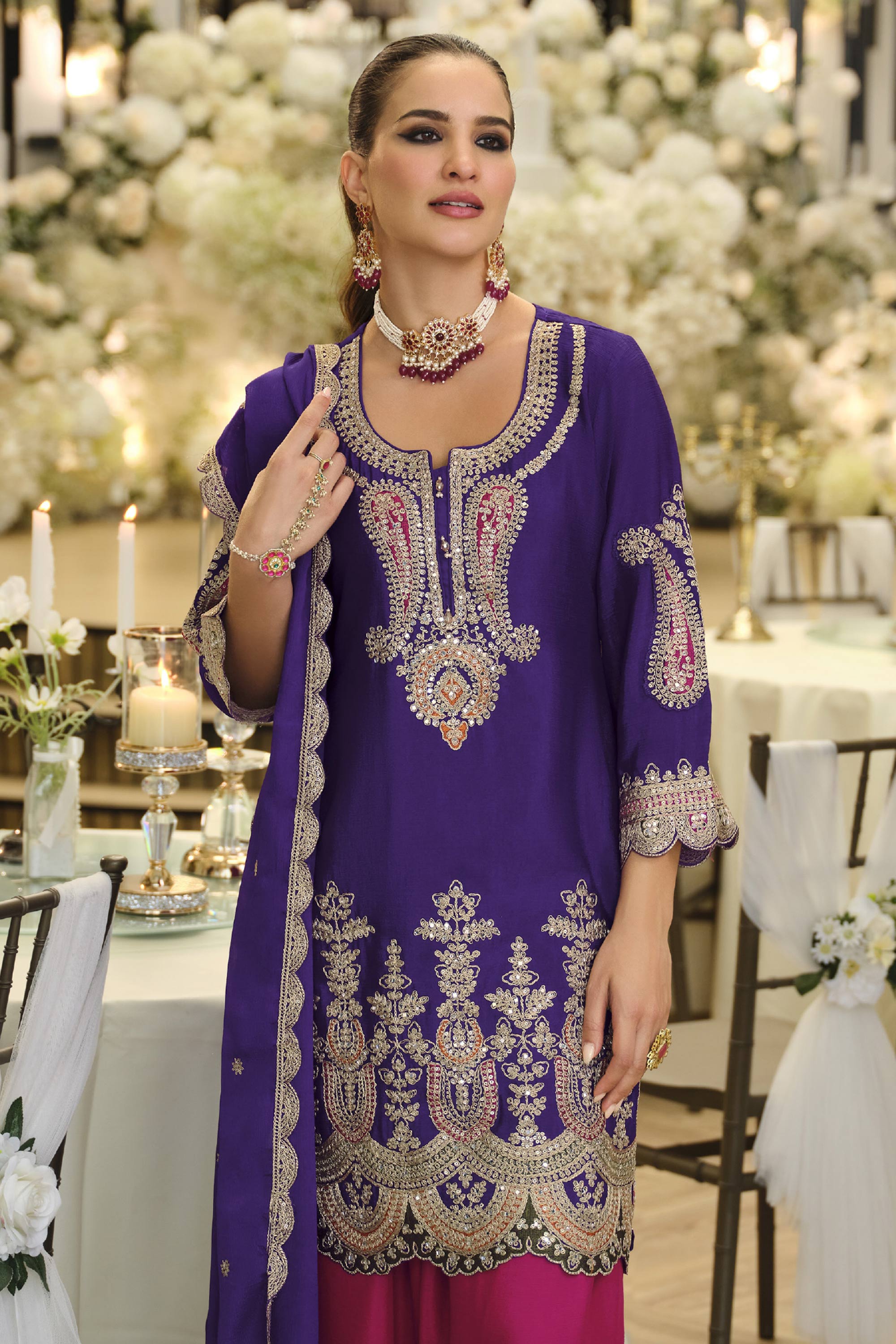 Embroidered Chinon Blue Readymade Palazzo Suit With Dupatta For Festive Wear
