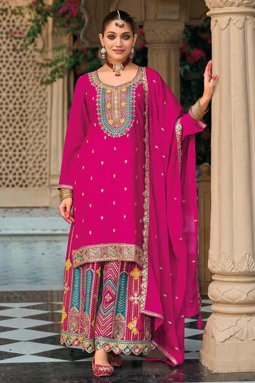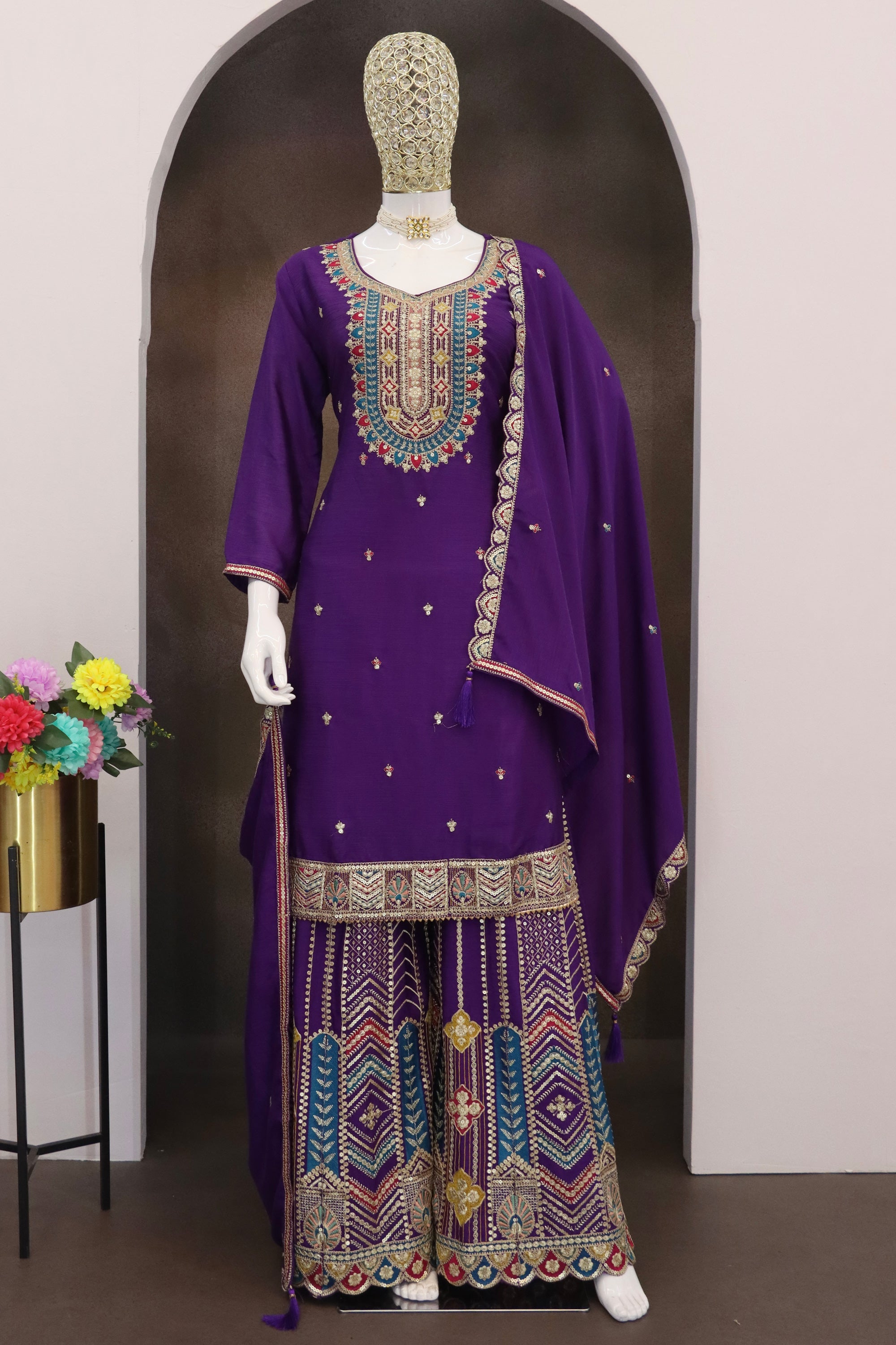 Embroidered Chinon Purple Designer Readymade Palazzo Salwar Kameez