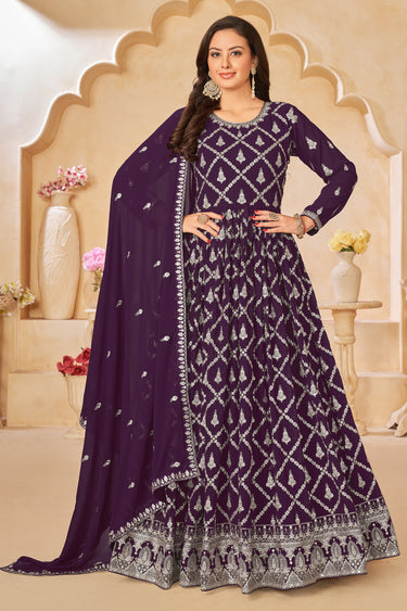 Embroidered Georgette Fabric Long Anarkali Suit In Purple Color