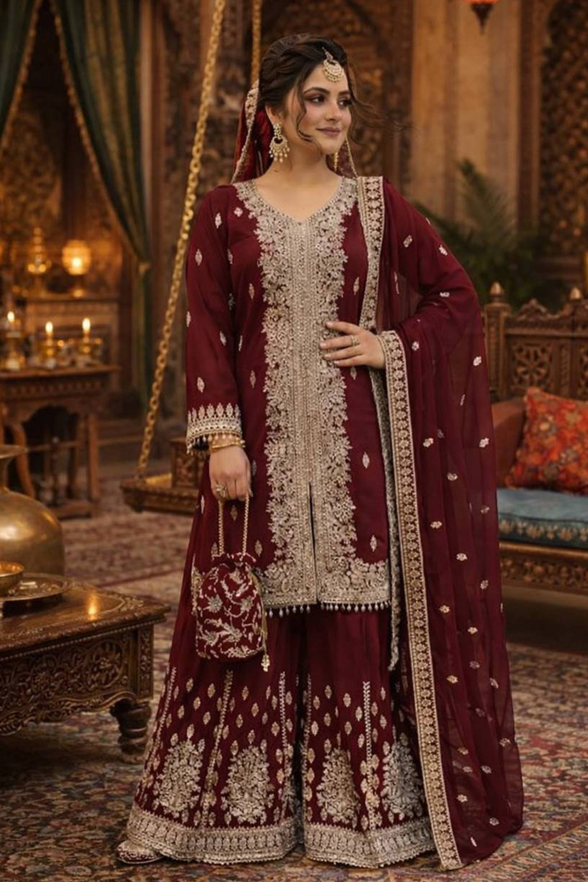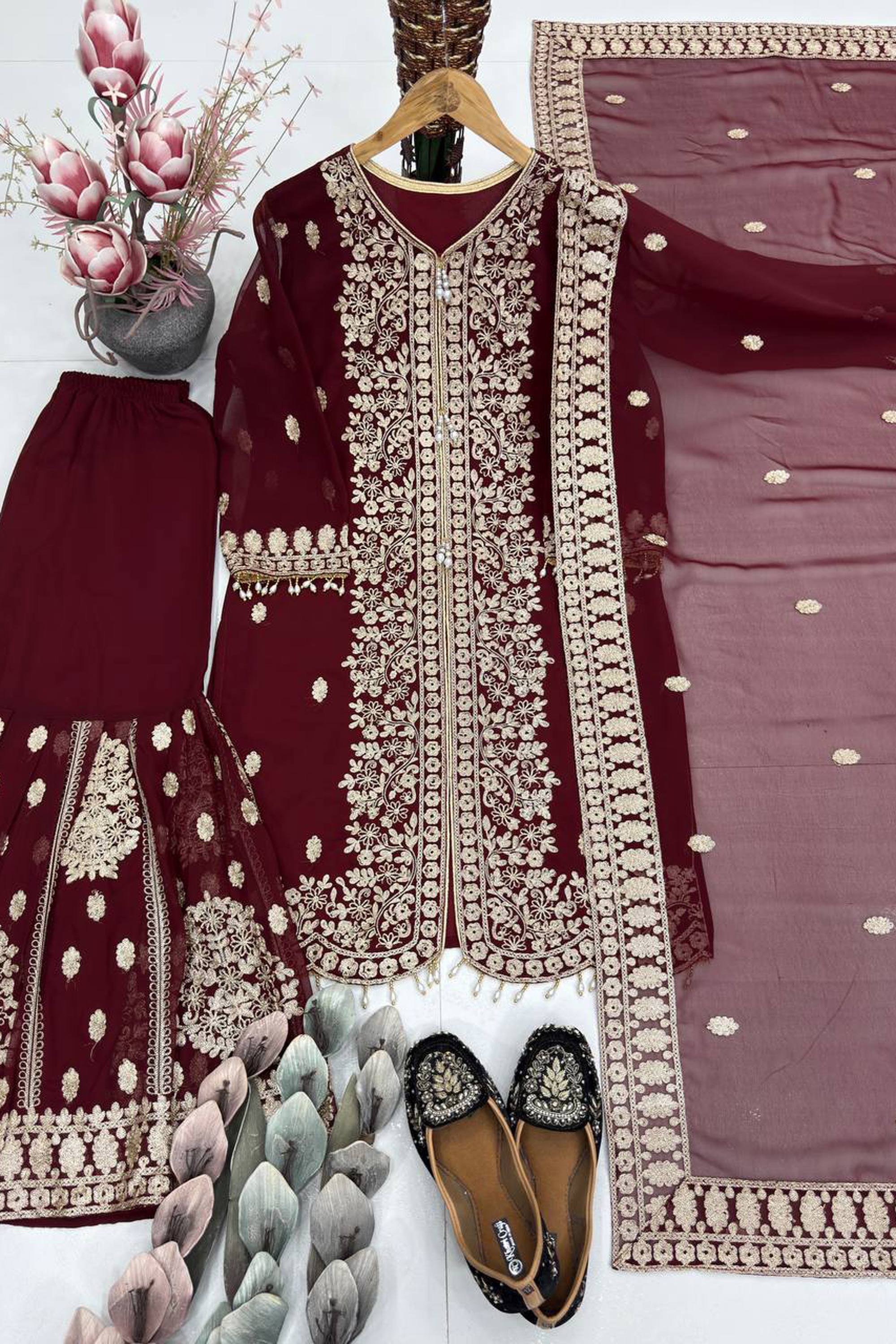 Embroidered Georgette Maroon Function Wear Readymade Palazzo Suit