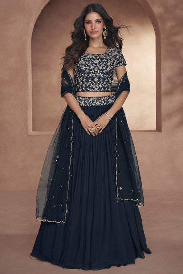 Embroidered Navy Blue Sangeet Wear Readymade Lehenga In Art Silk Fabric With Designer Choli
