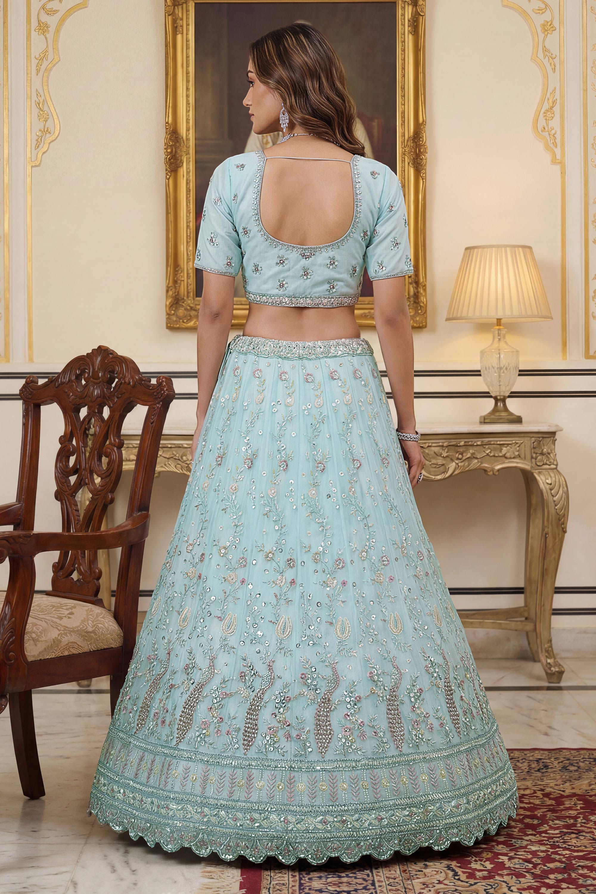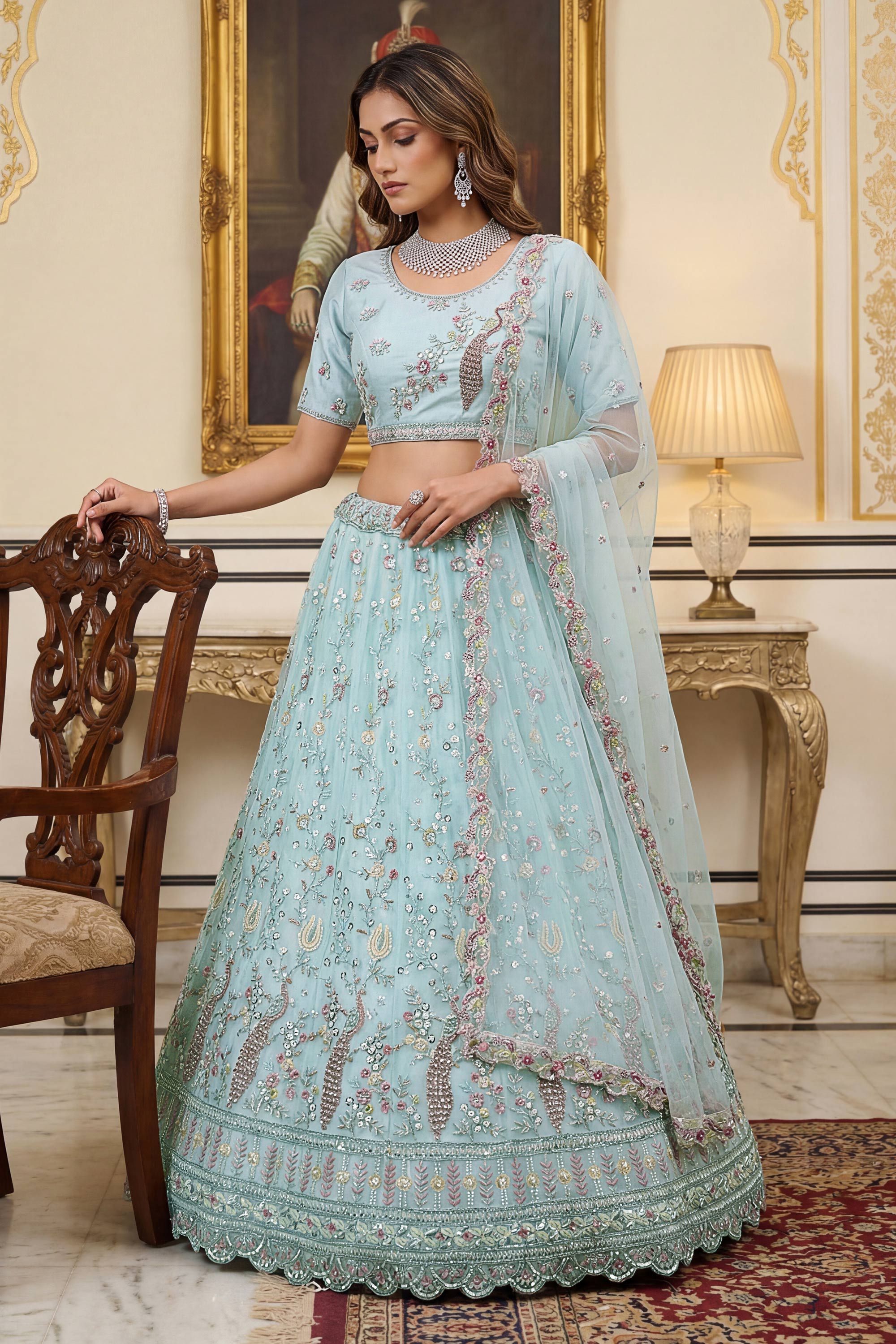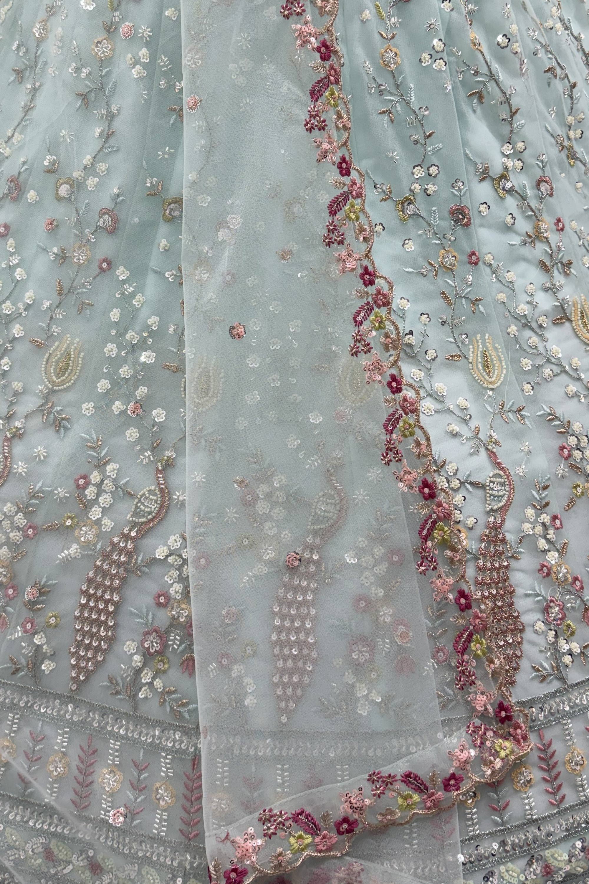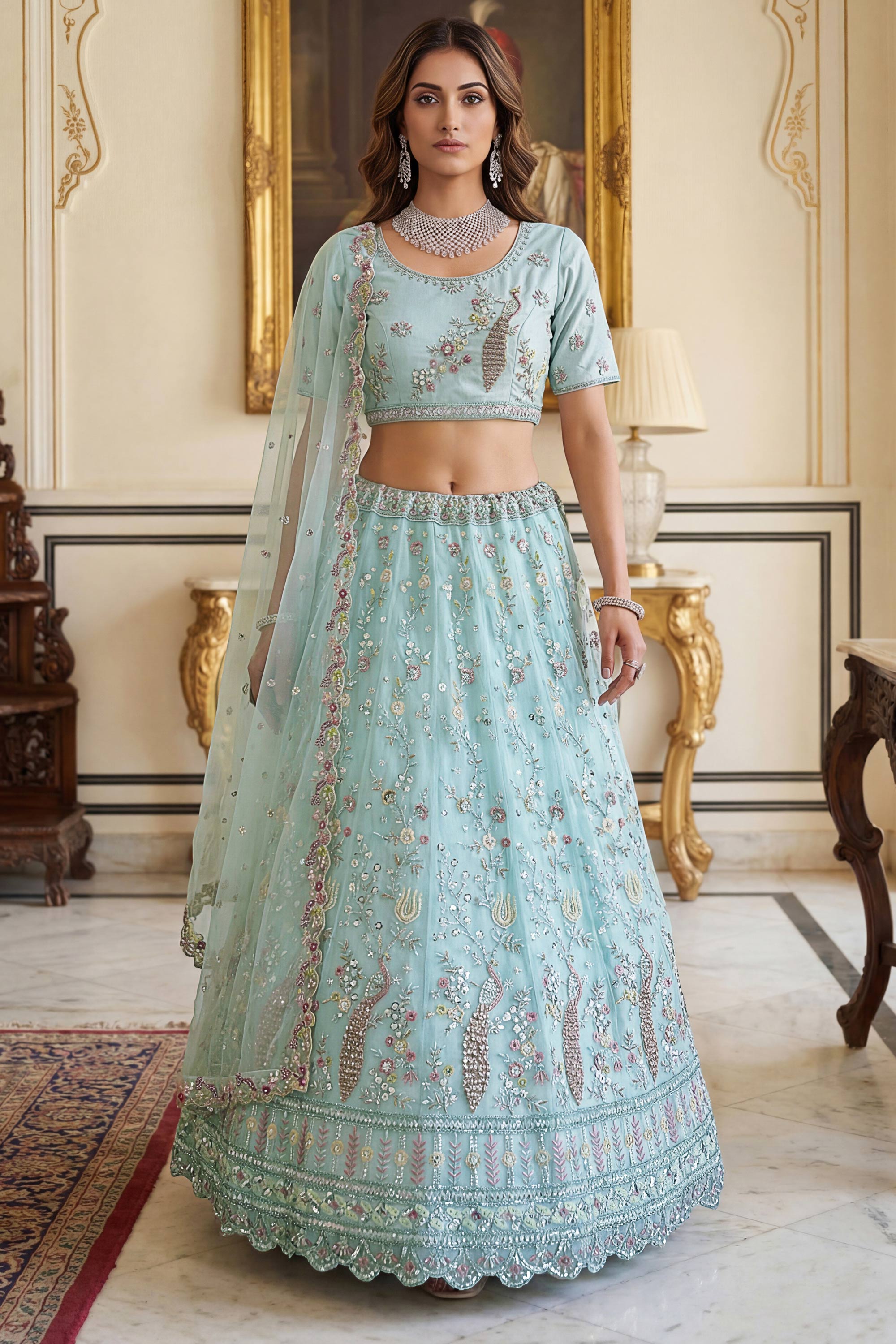 Embroidered Net Cyan Lehenga Choli For Wedding Wear