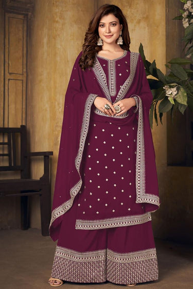 Embroidered Work Georgette Fabric Festival Wear Luxurious Palazzo Suit In Maroon Color