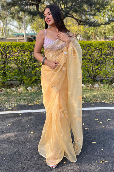 Embroidery Work Beige Organza Festive Wear Saree With Blouse
