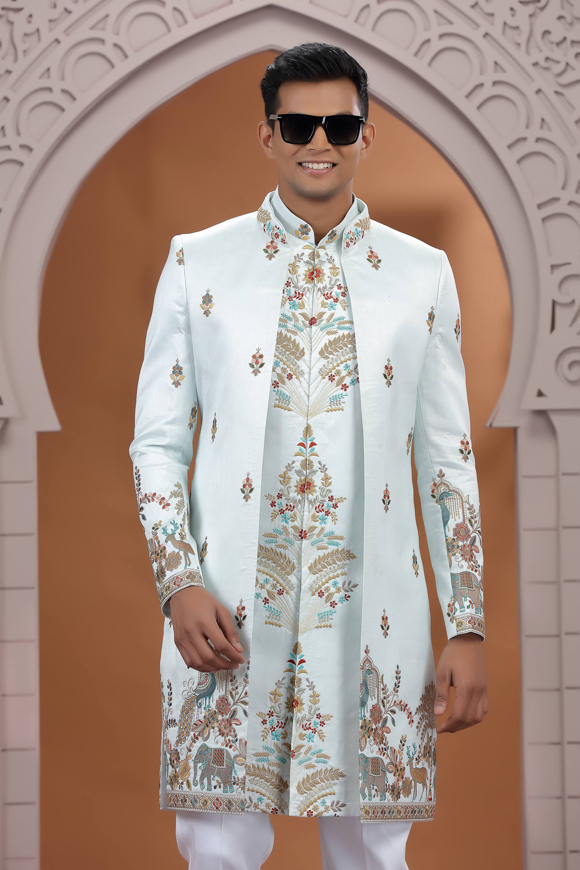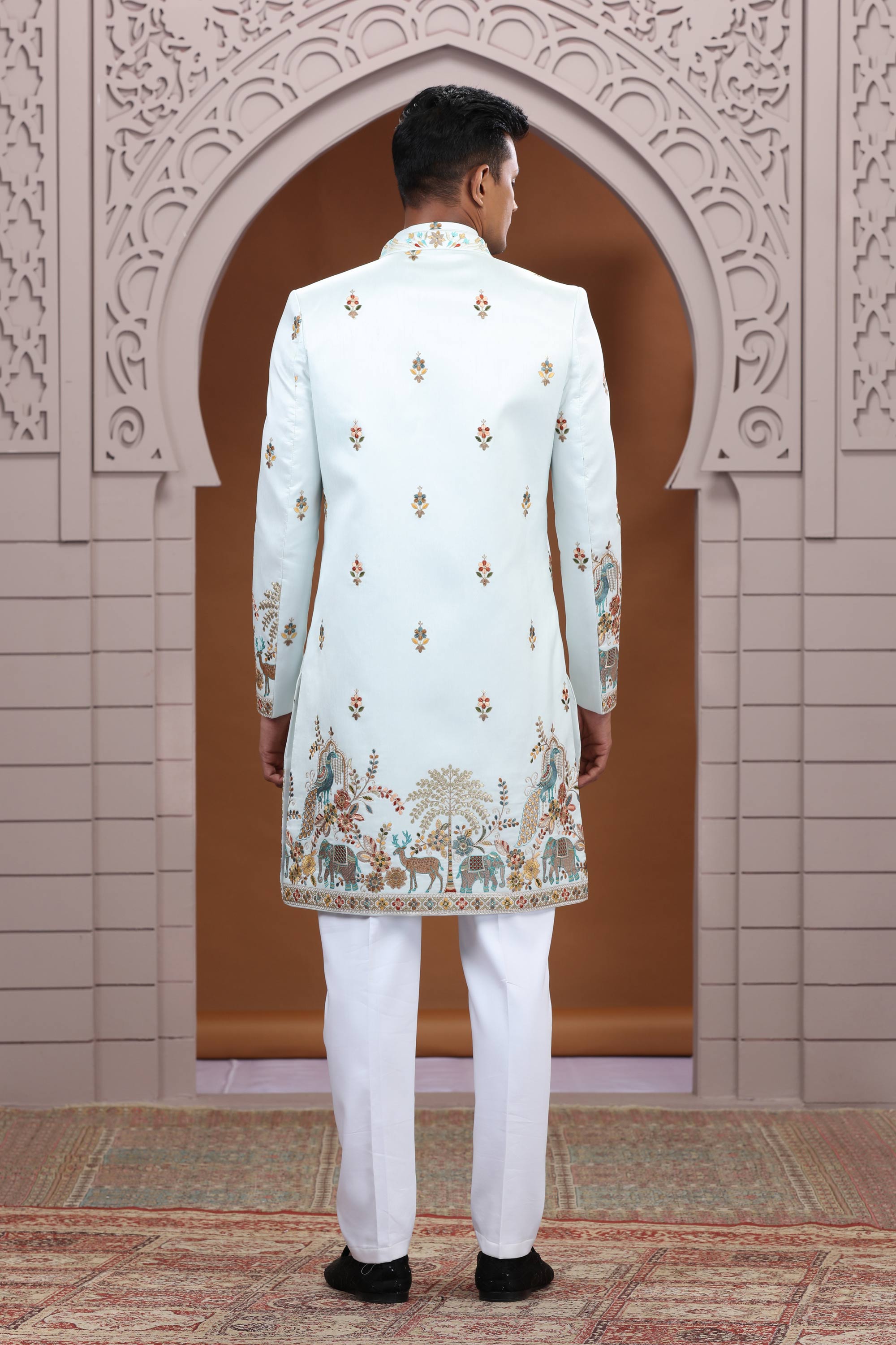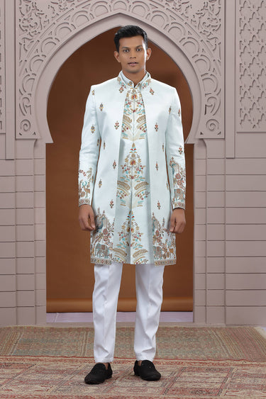 Embroidery Work Light Cyan Readymade 3 Piece Indo Western For Men