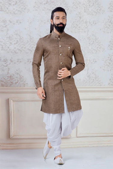 Engaging Brown Color Linen Fabric Festive Wear Trendy Readymade Dhoti Style Indo Western For Men