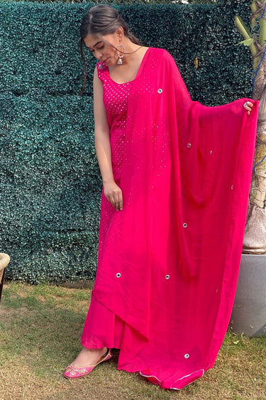 Engaging Georgette Fabric Festive Wear Embroidered Rani Color Readymade Palazzo Suit