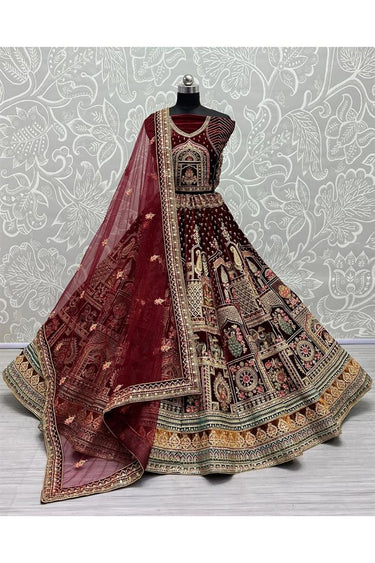 Engaging Maroon Color Velvet Fabric Bridal Lehenga For Wedding