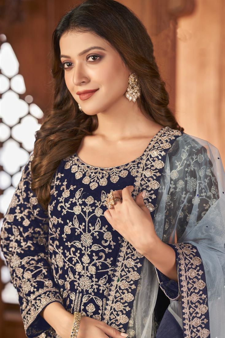 Engaging Navy Blue Color Velvet Fabric Anarkali Suit In Function Wear