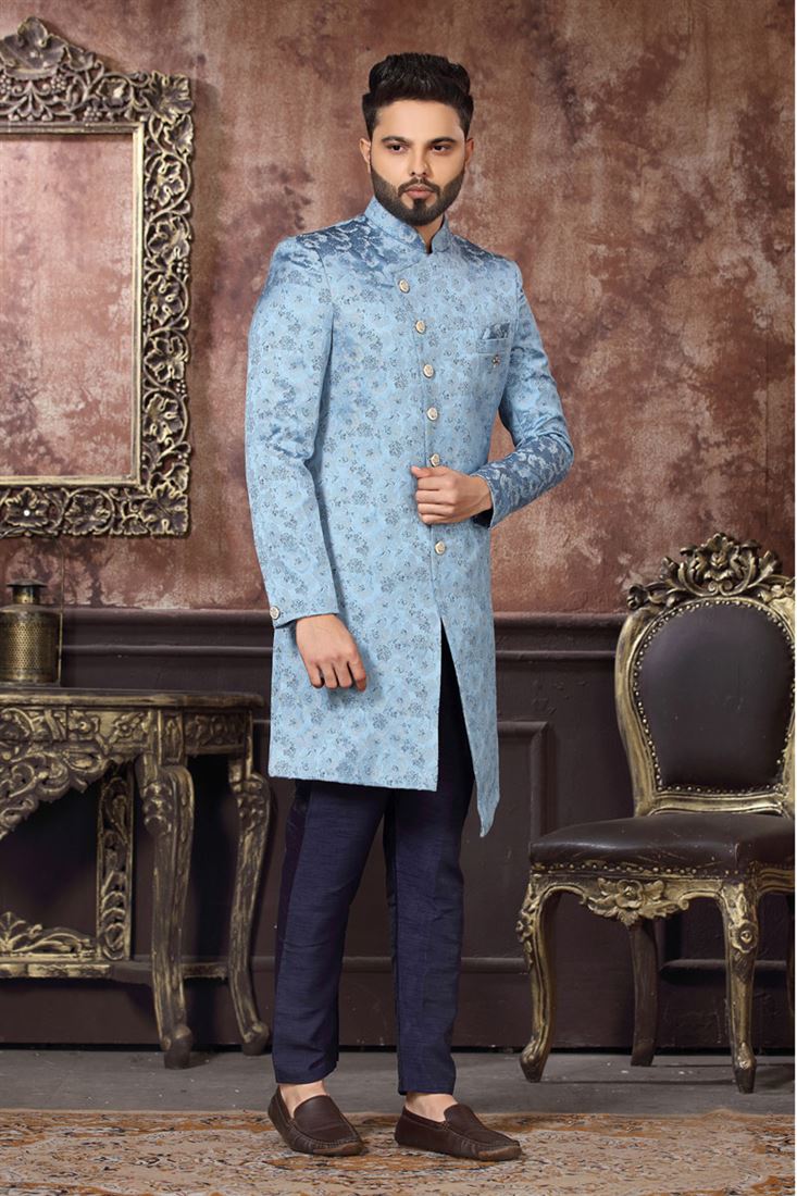 The Sky Blue Readymade Indo Western outfit is perfect for wedding ceremonies, receptions, and other festive occasions. Its timeless appeal and fusion of traditional and contemporary styles make it suitable for men of all ages and preferences.