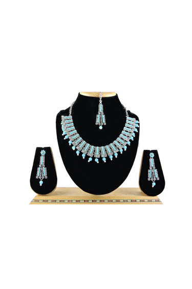 Entrancing Alloy Material Necklace Set Earrings And Mang Tikka For Women In Sky Blue Color