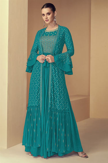 Eugeniya Belousova Alluring Georgette Fabric Cyan Color Palazzo Suit