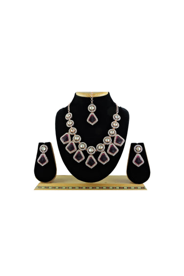 Excellent Alloy Material Purple Color Necklace With Earrings And Mang Tikka