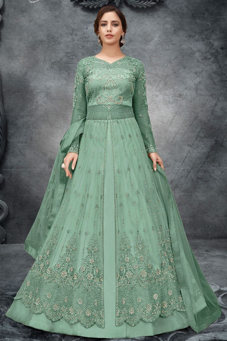 Excellent Satin Fabric Sea Green Color Embroidered Anarkali Suit