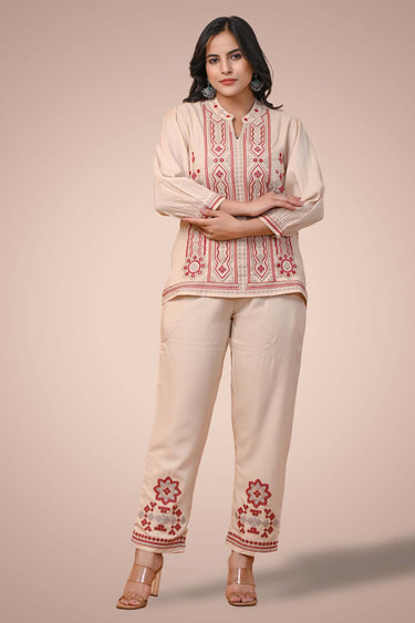 Exclusive Beige Color Cotton Fabric Embroidered Relaxed Sleeves Readymade Co Ord Set
